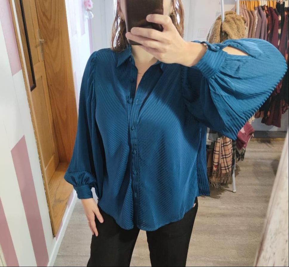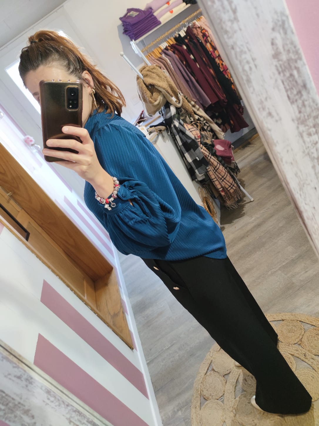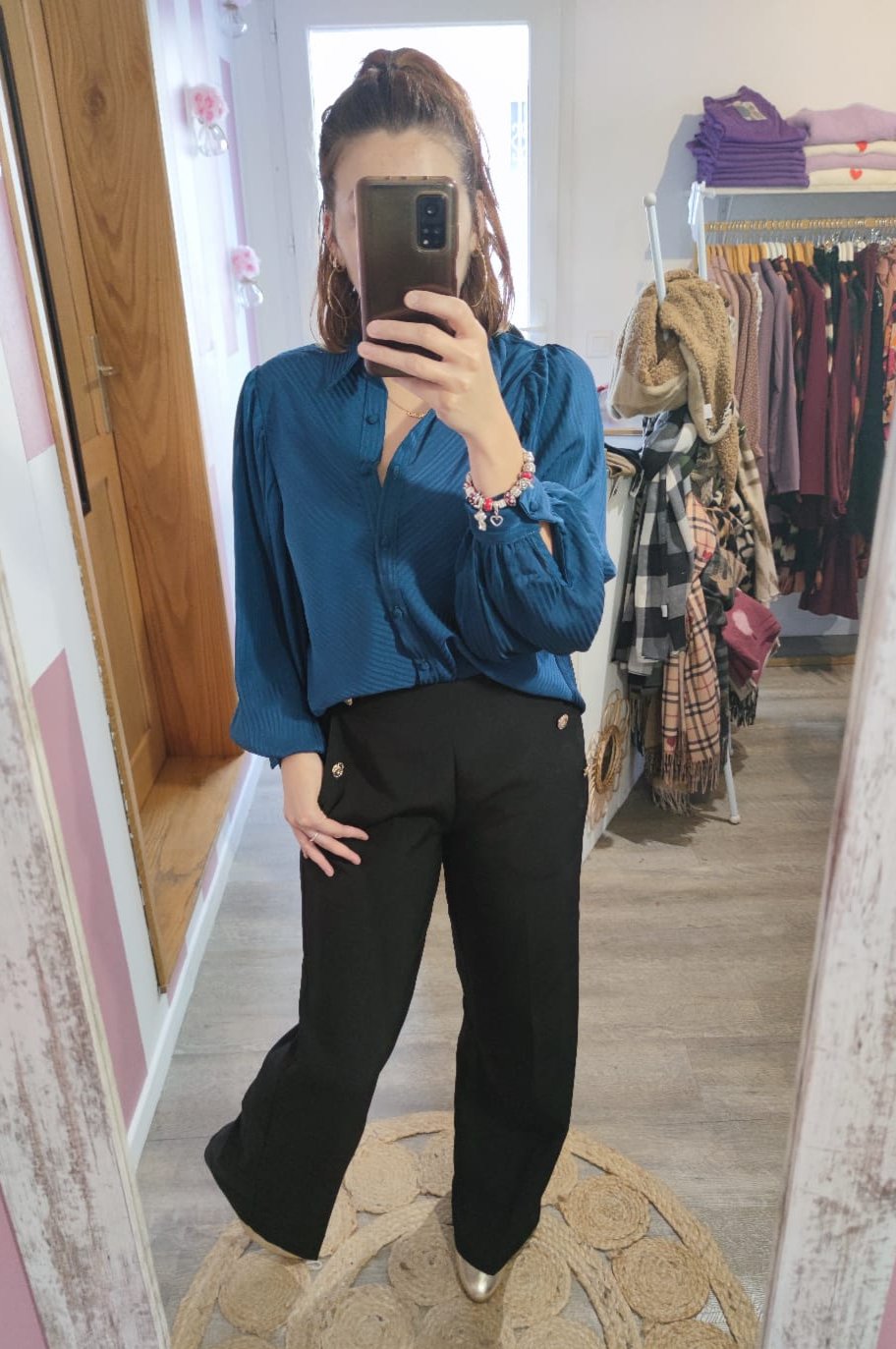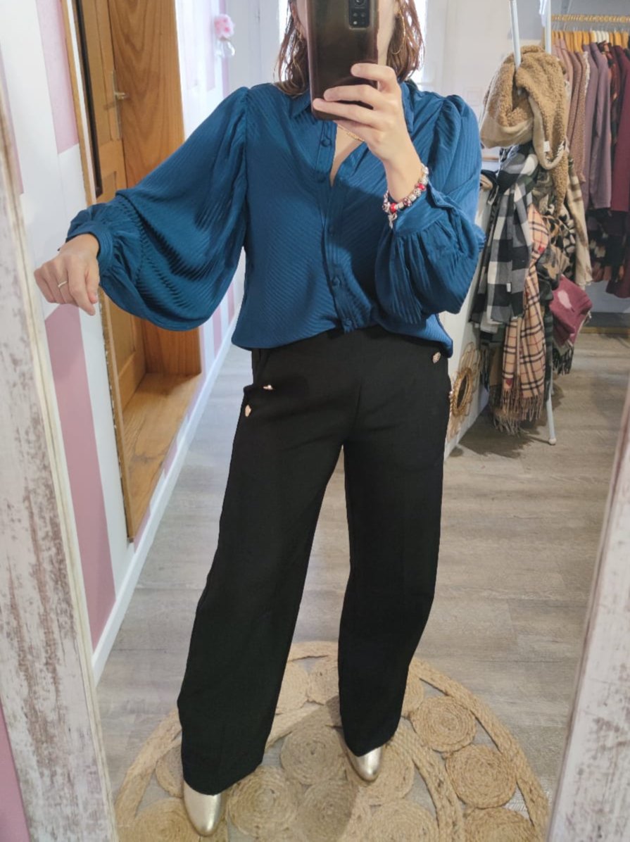. Manches longues, larges et bouffantes resserrées aux poignets, boutons recouverts.