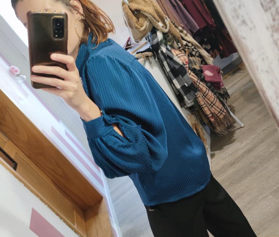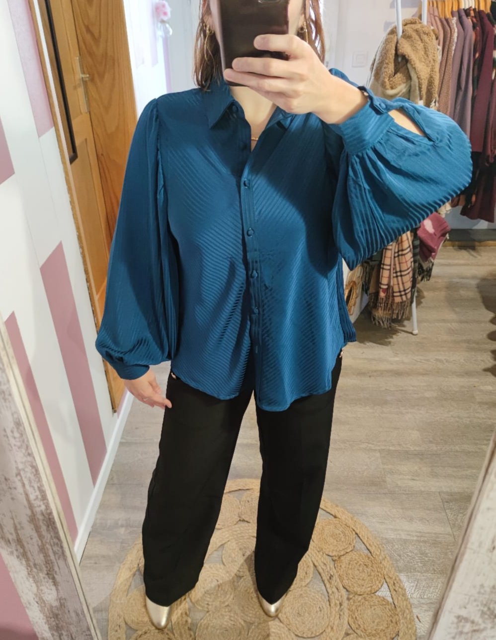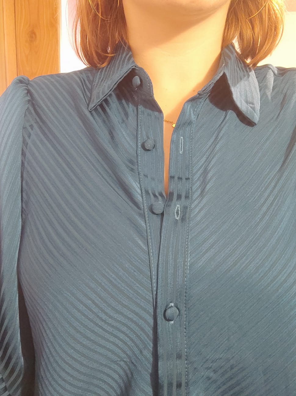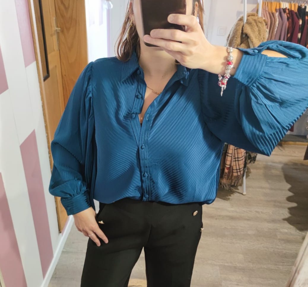 . Manches longues, larges et bouffantes resserrées aux poignets, boutons recouverts.