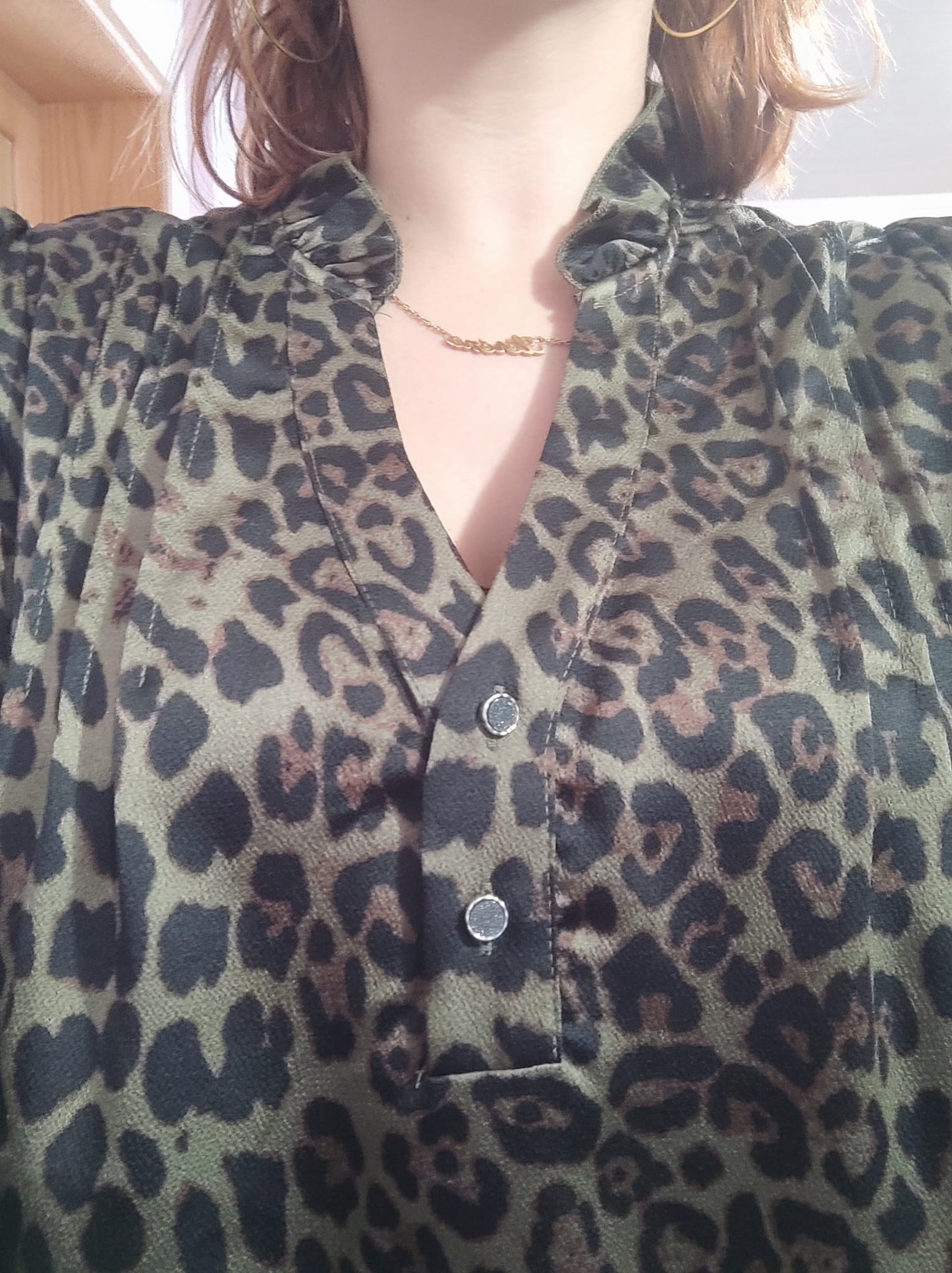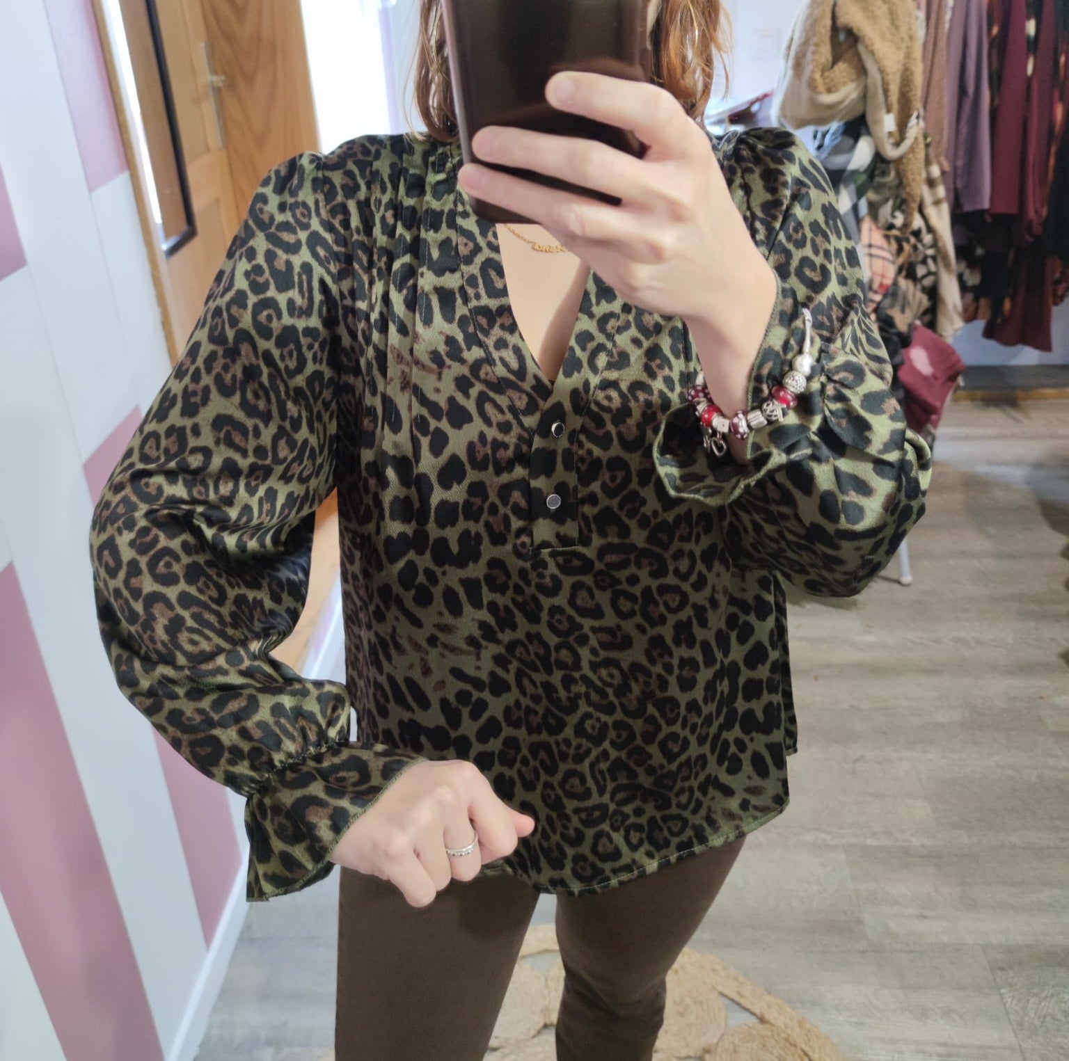 . Blouse kaki, décolleté en V, col froncé et poignets avec élastiques