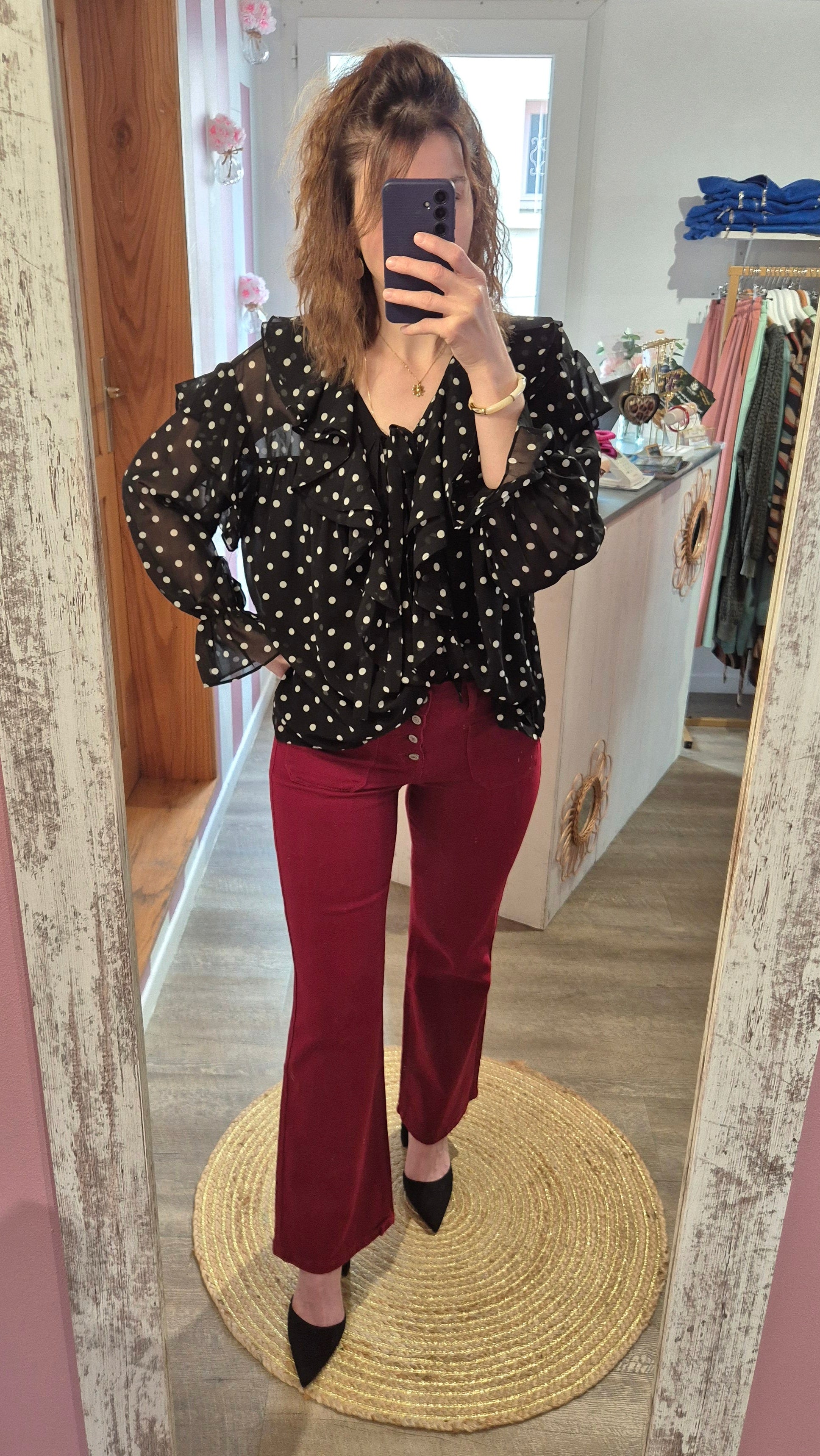 . Blouse noir à motif pois blanc