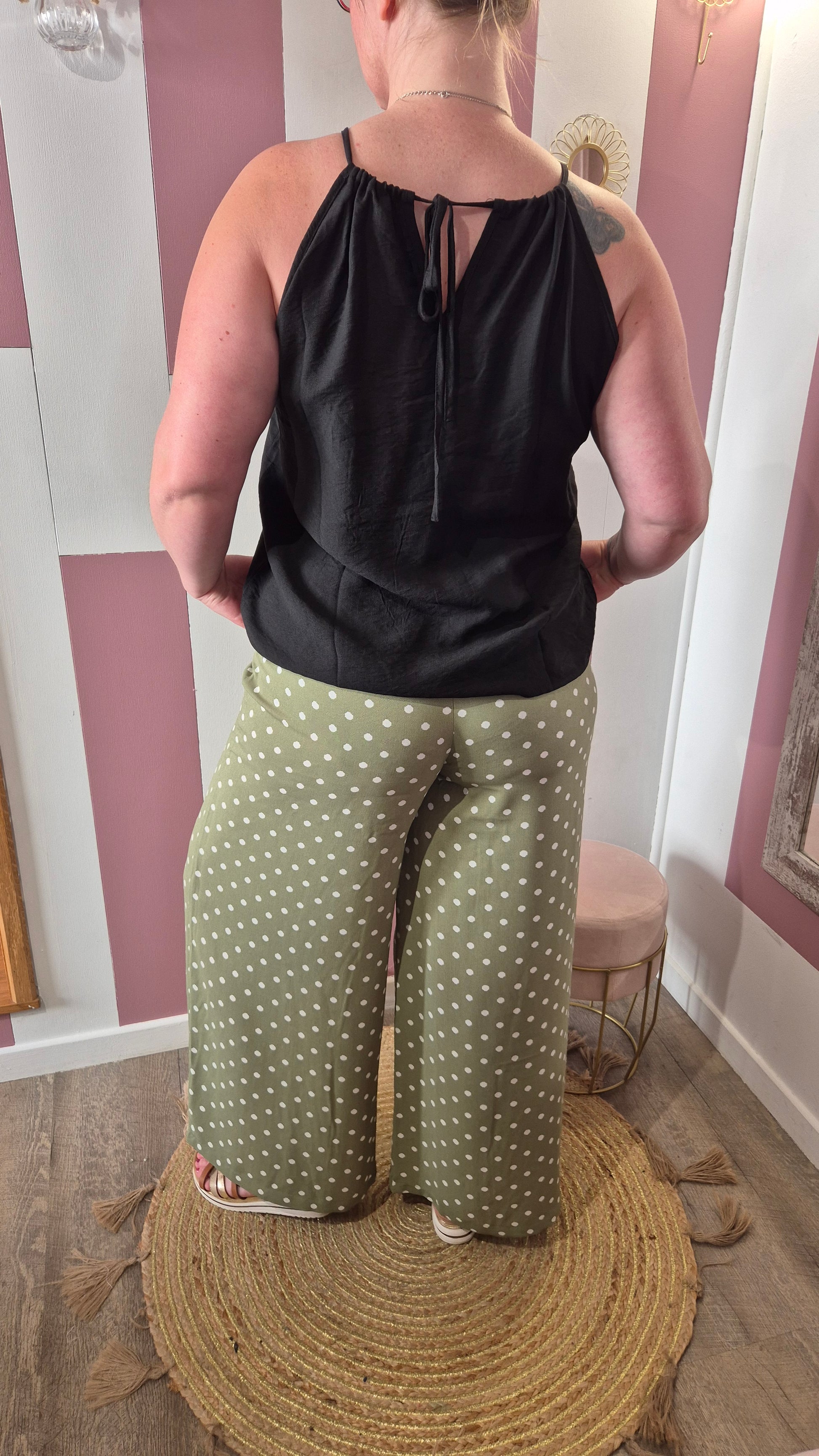 . Pantalon fluide kaki à pois écru