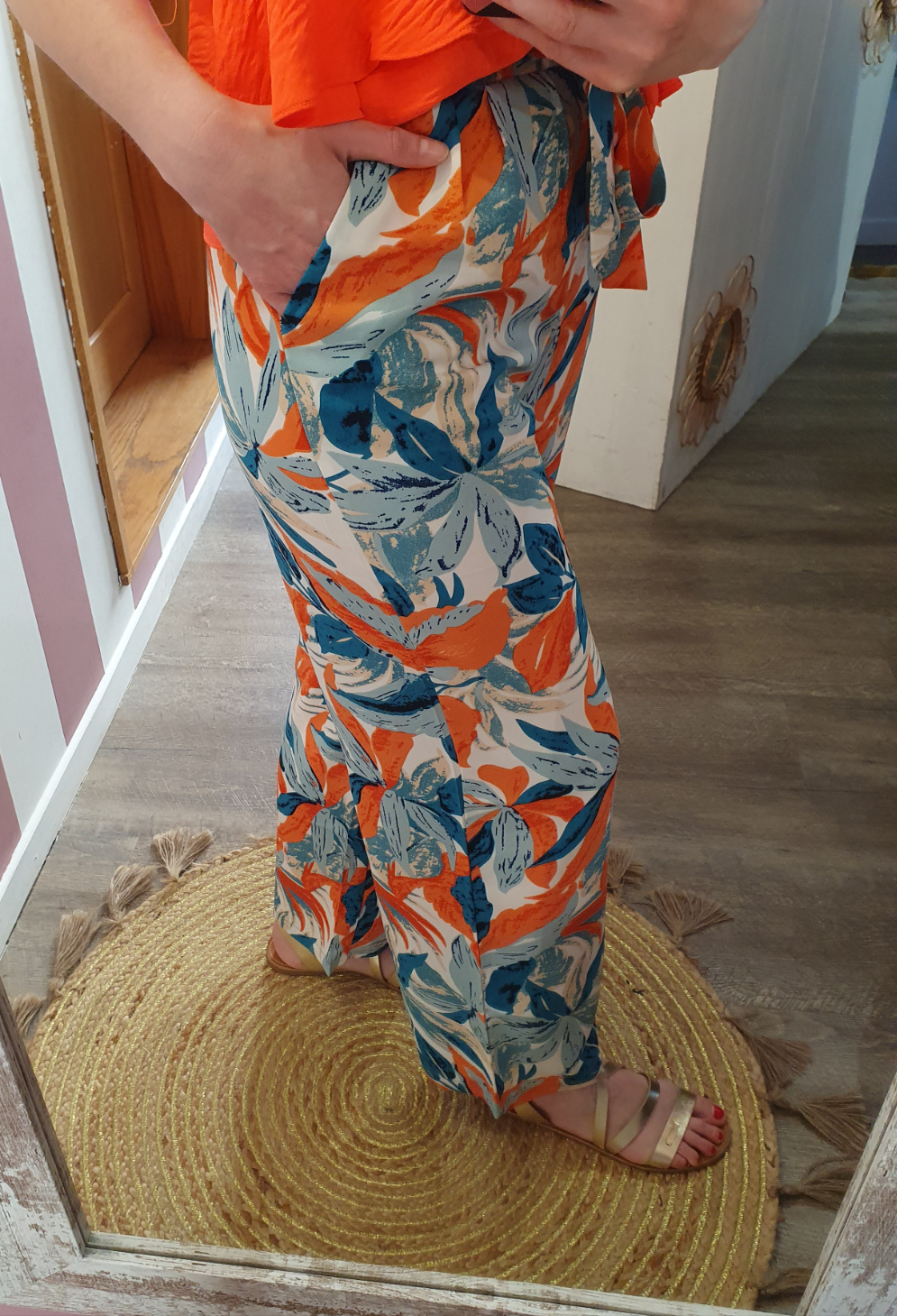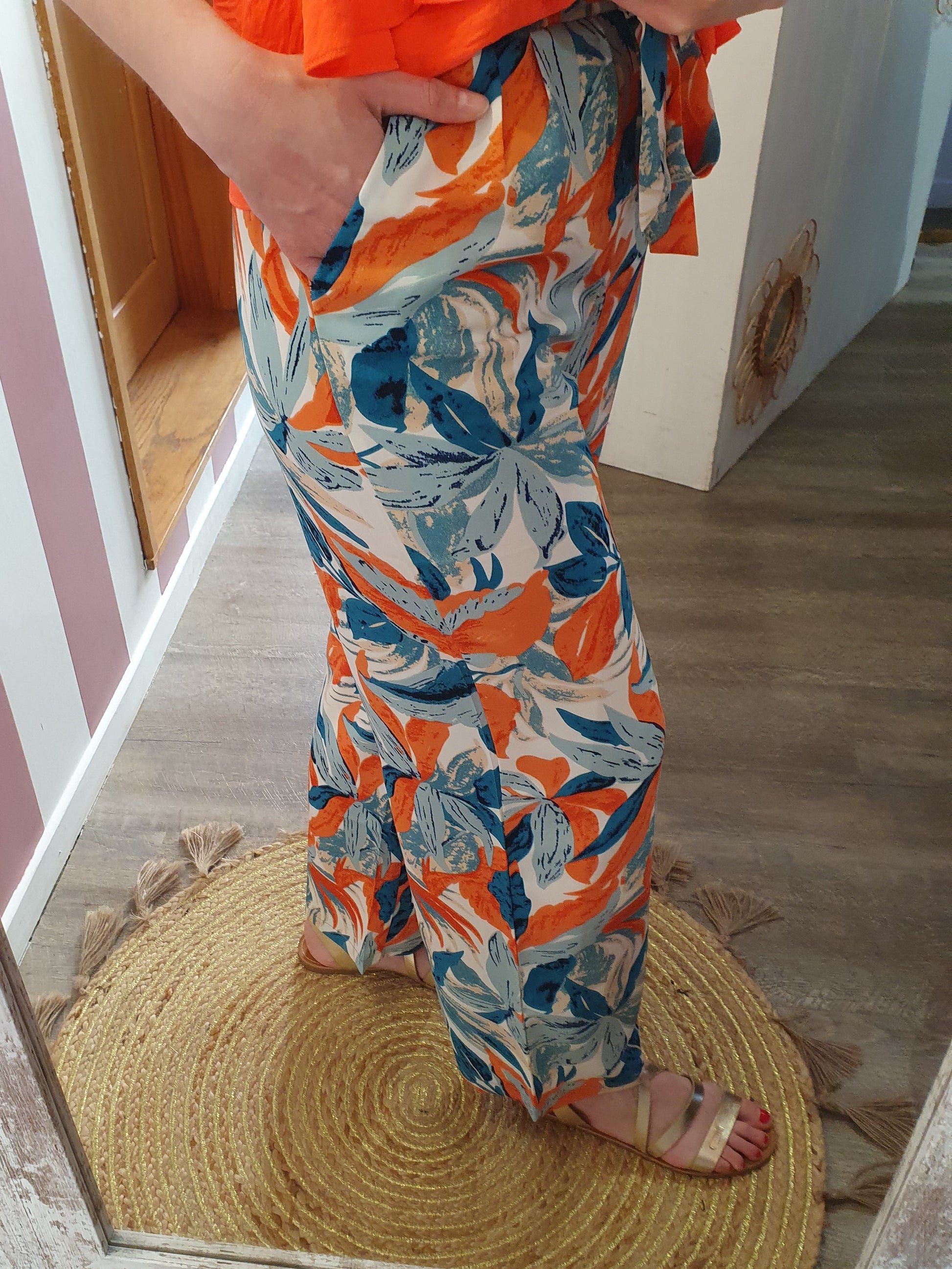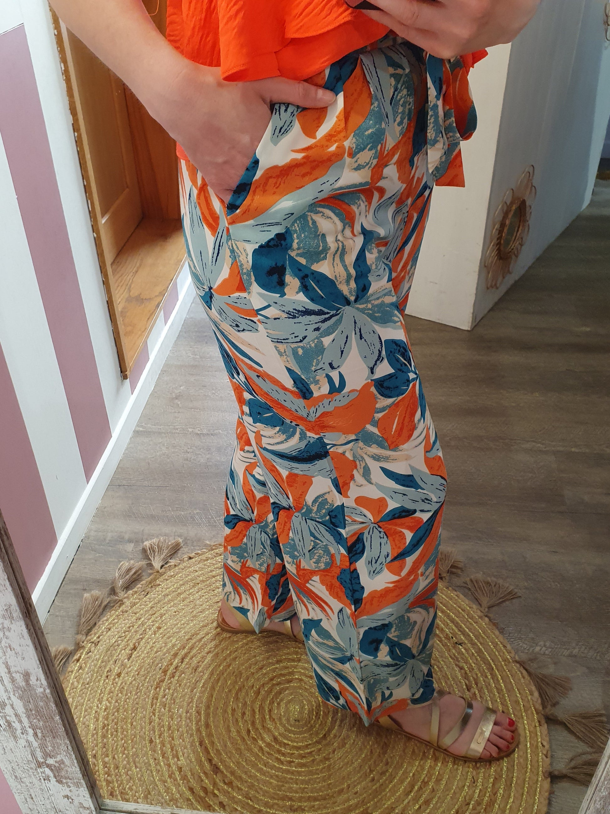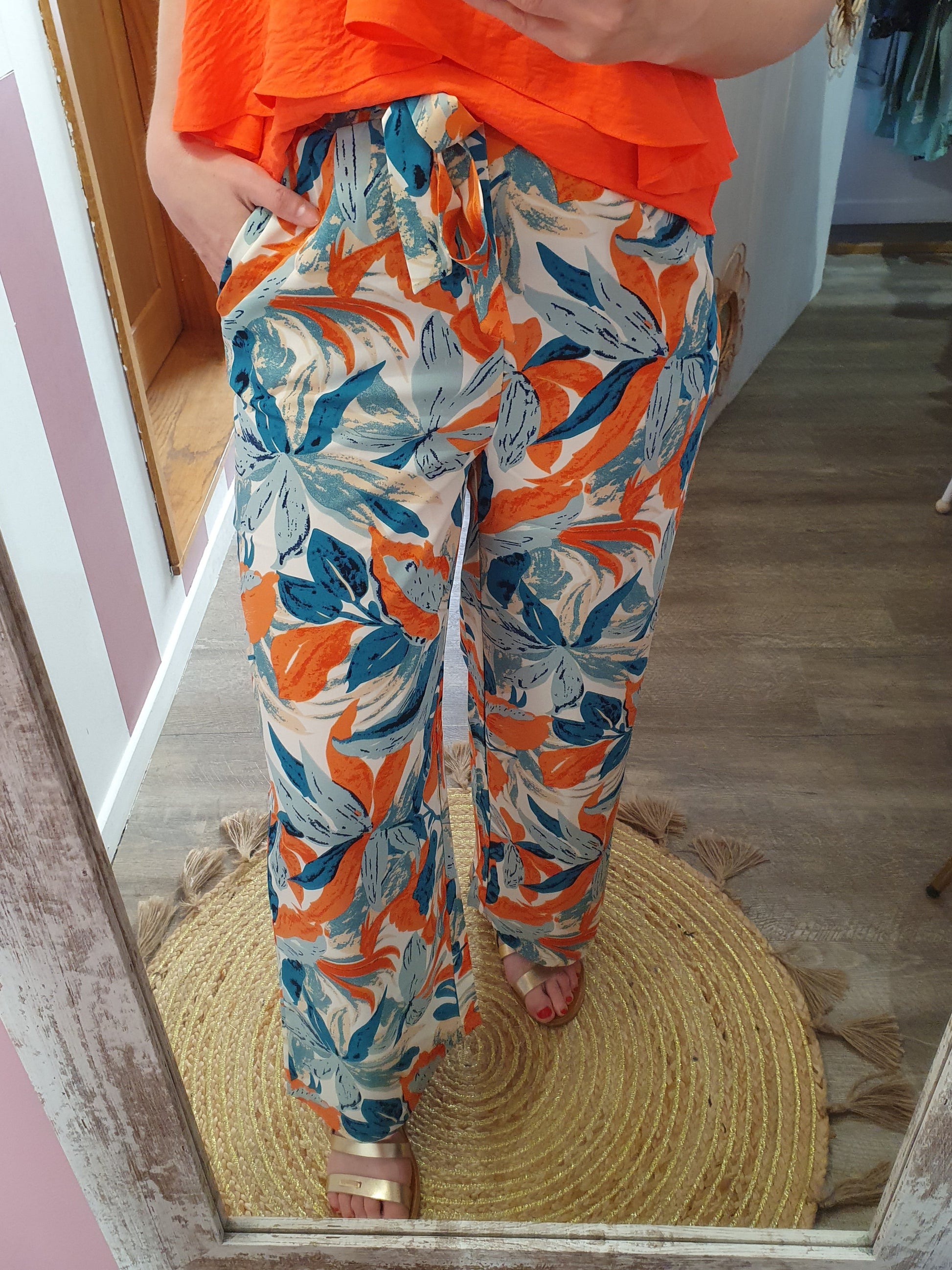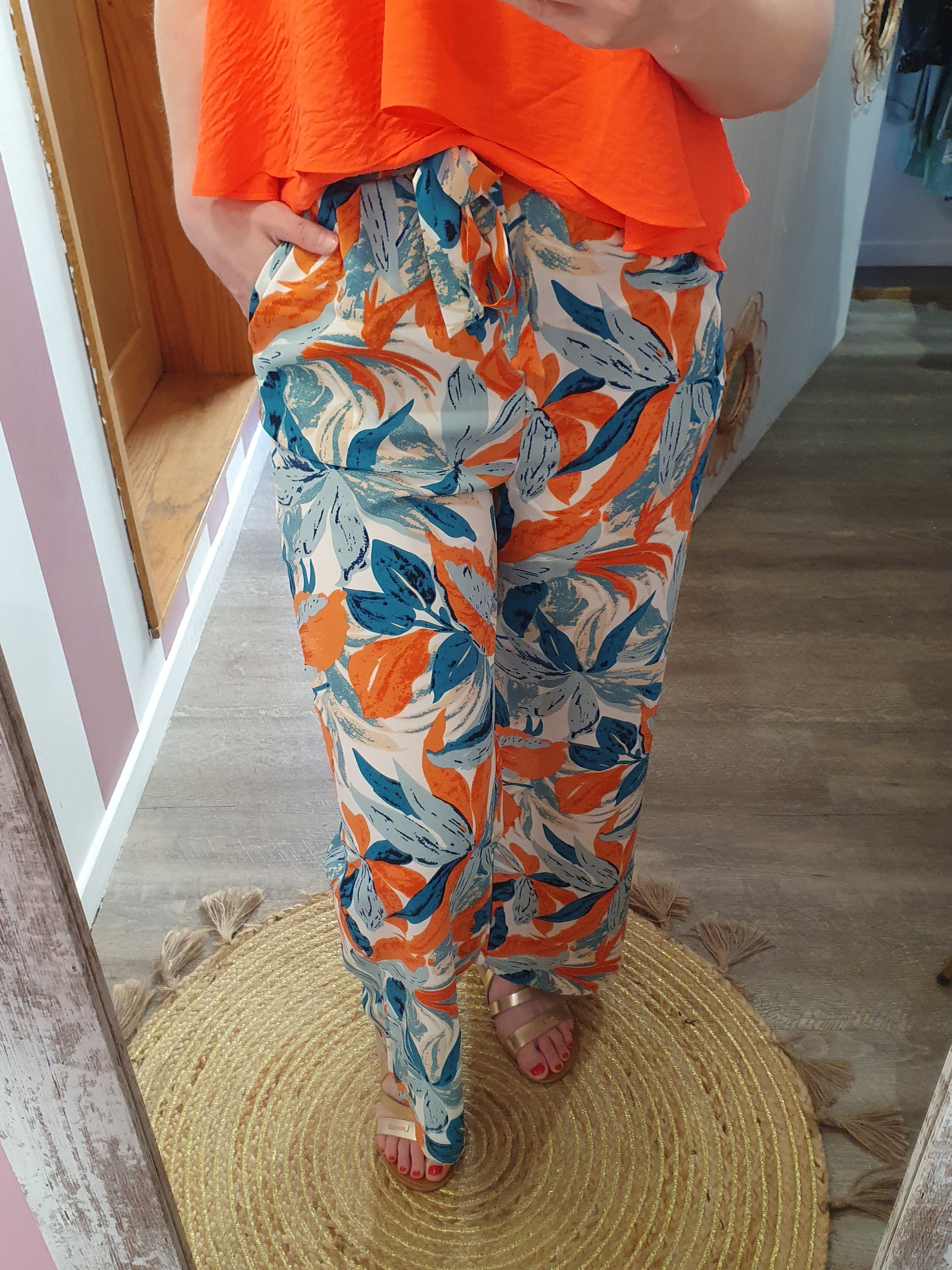 . pantalon fluide à motif feuillage, ceinture élastique avec lien à nouer devant, poches cotés