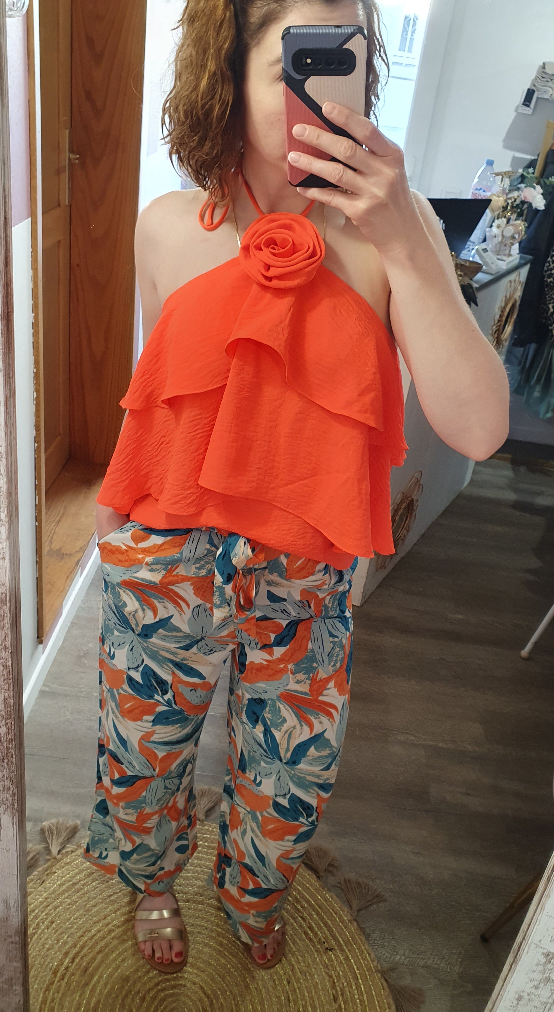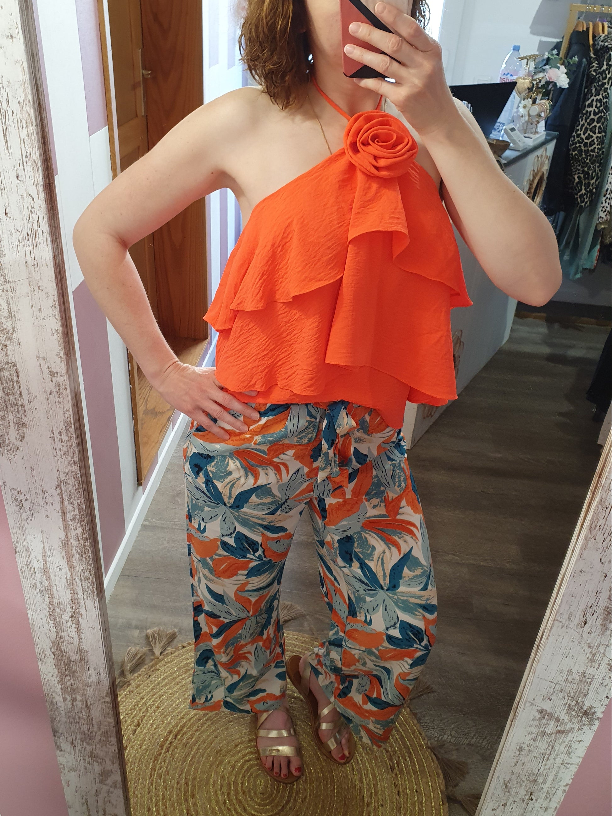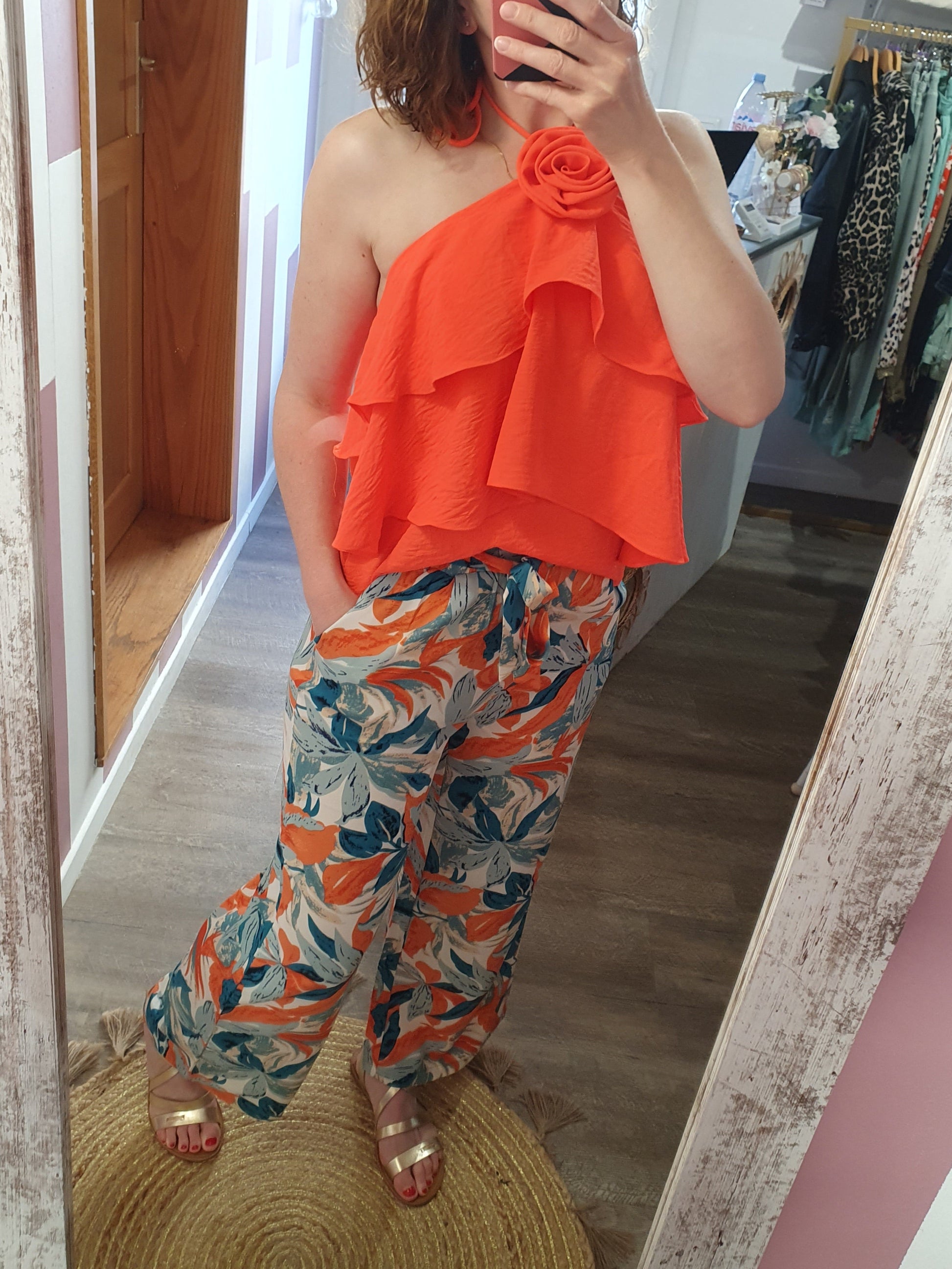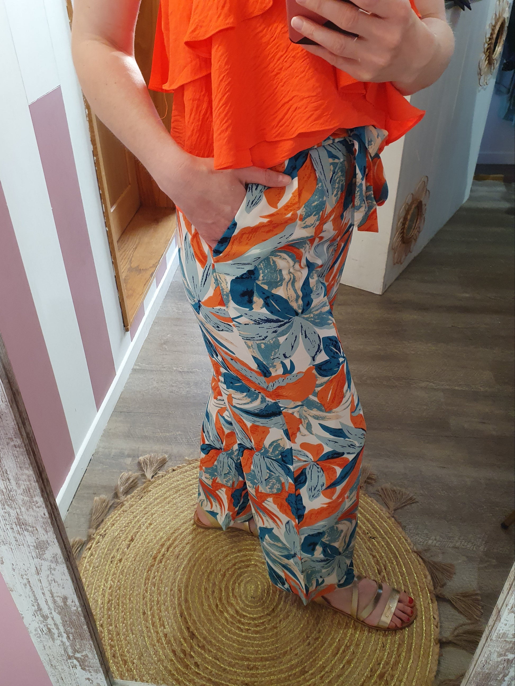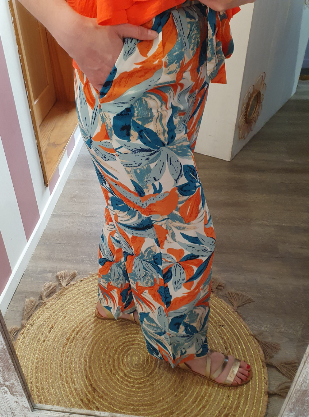 . pantalon fluide à motif feuillage, ceinture élastique avec lien à nouer devant, poches cotés