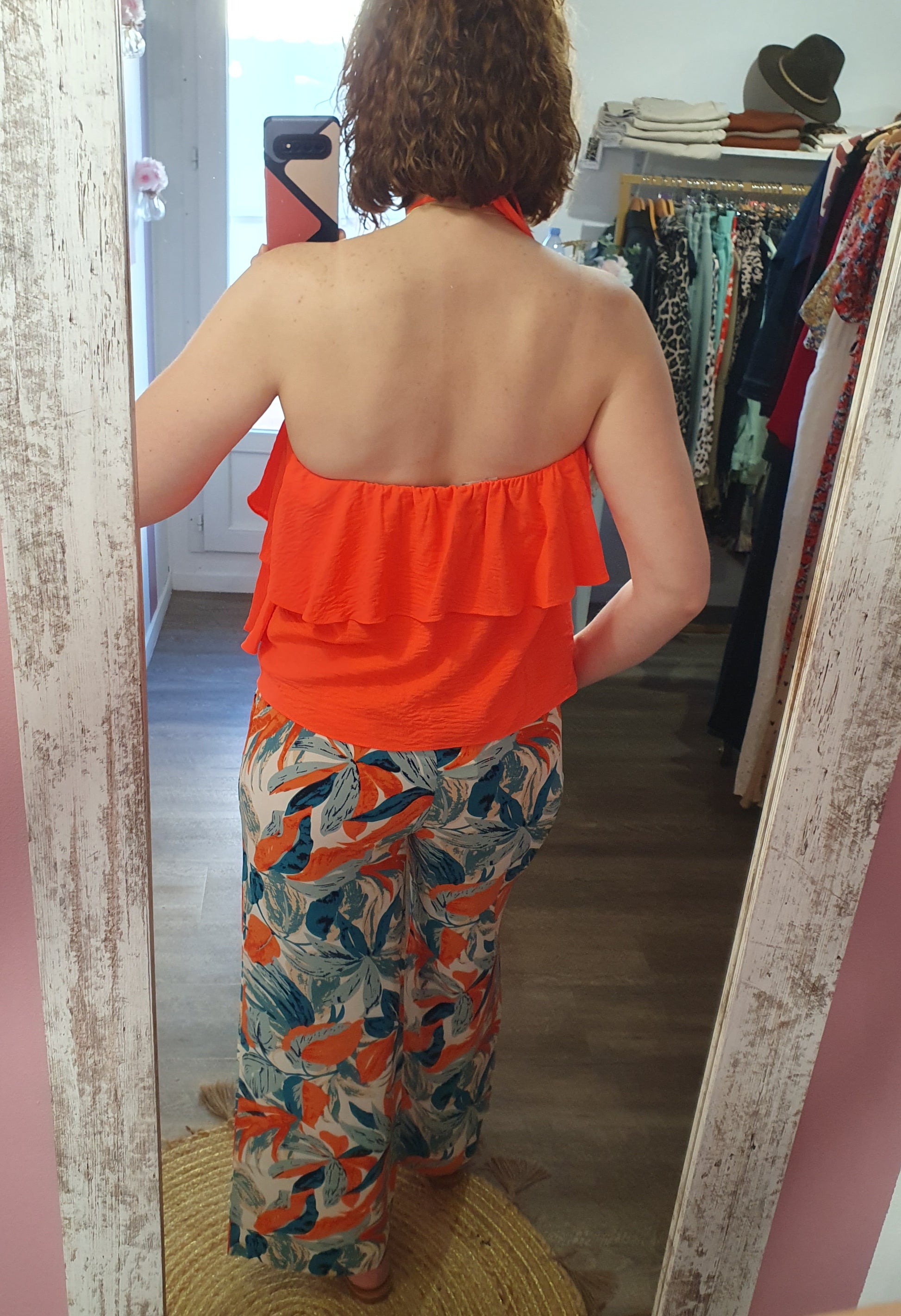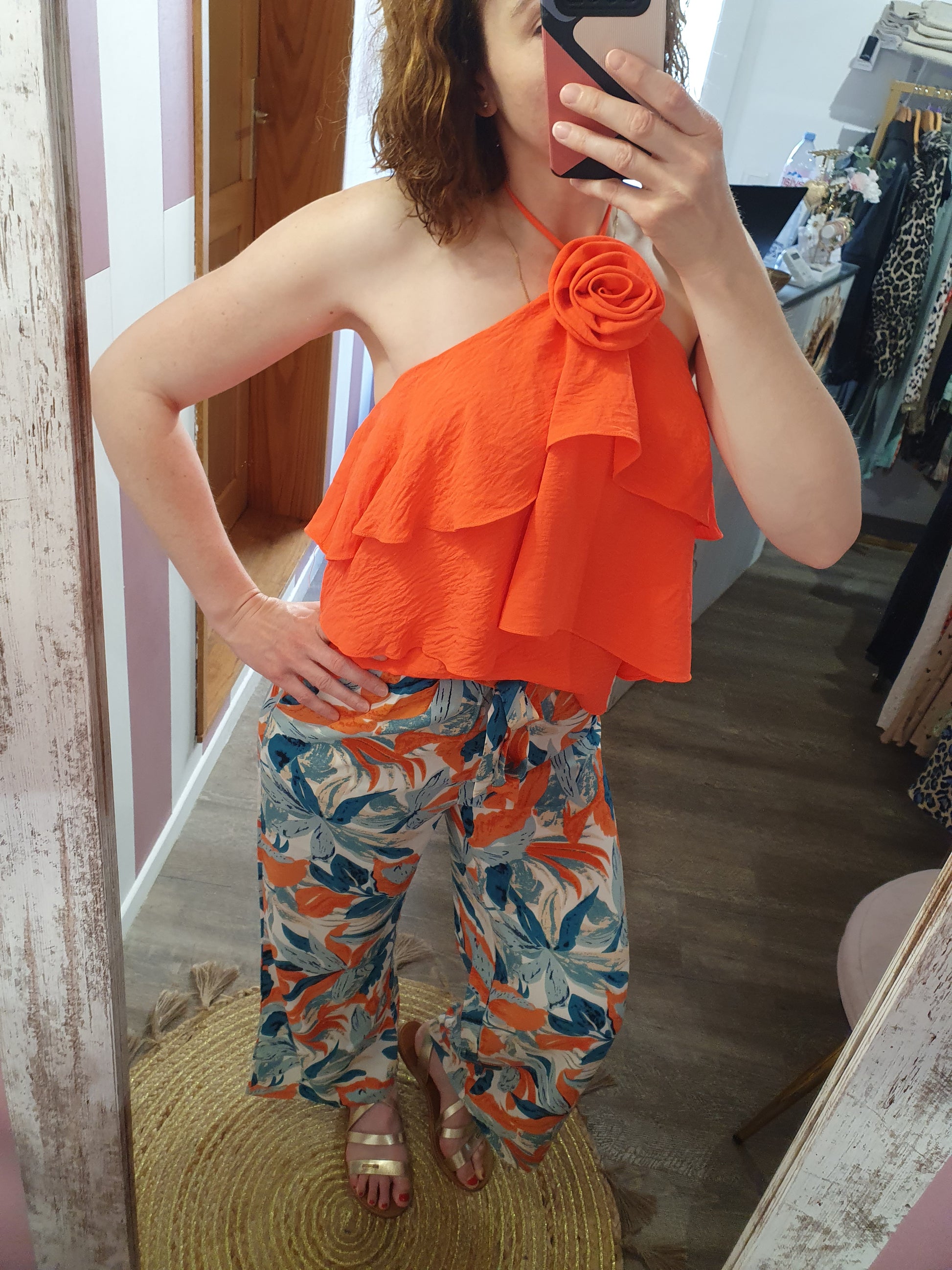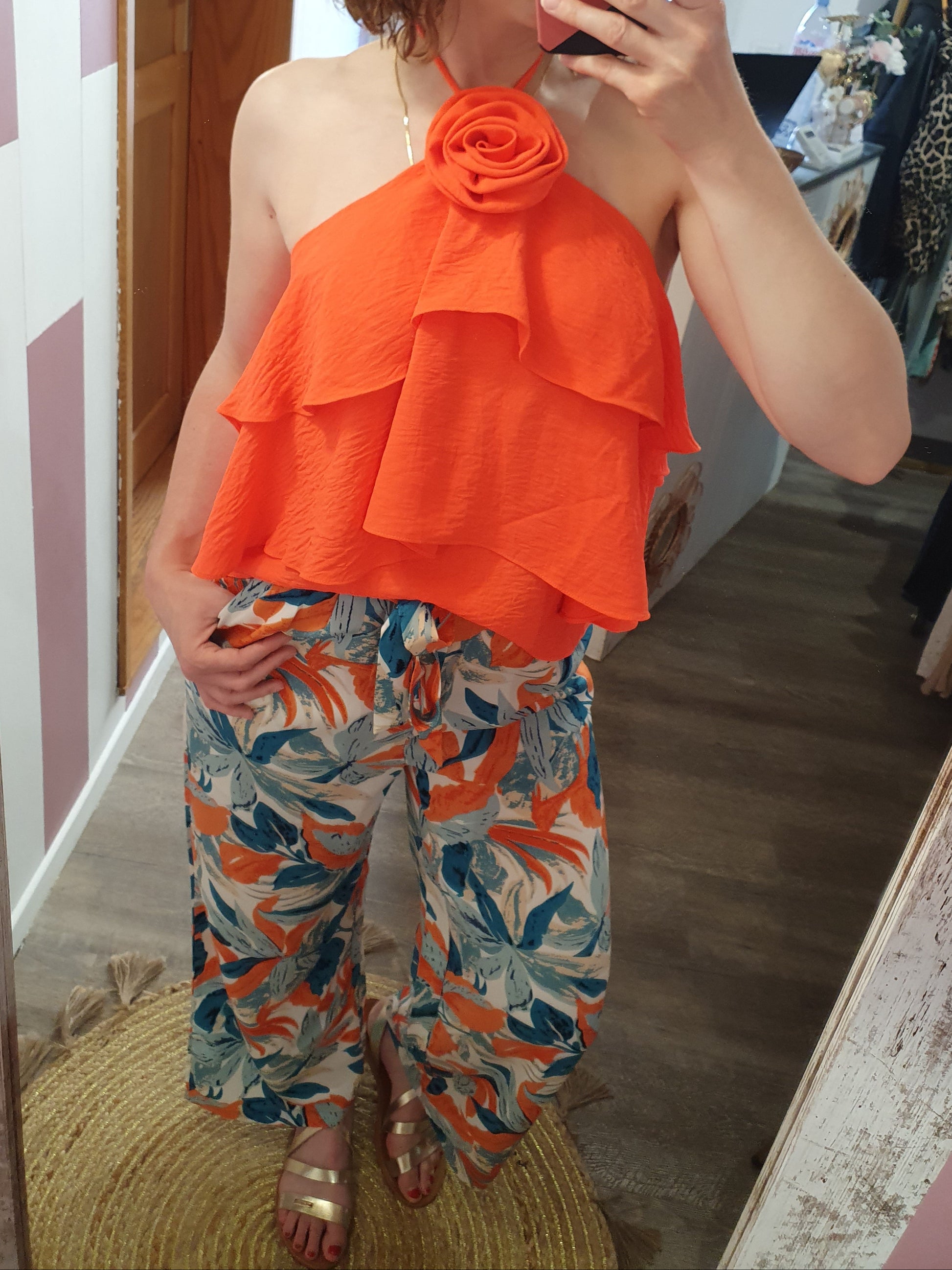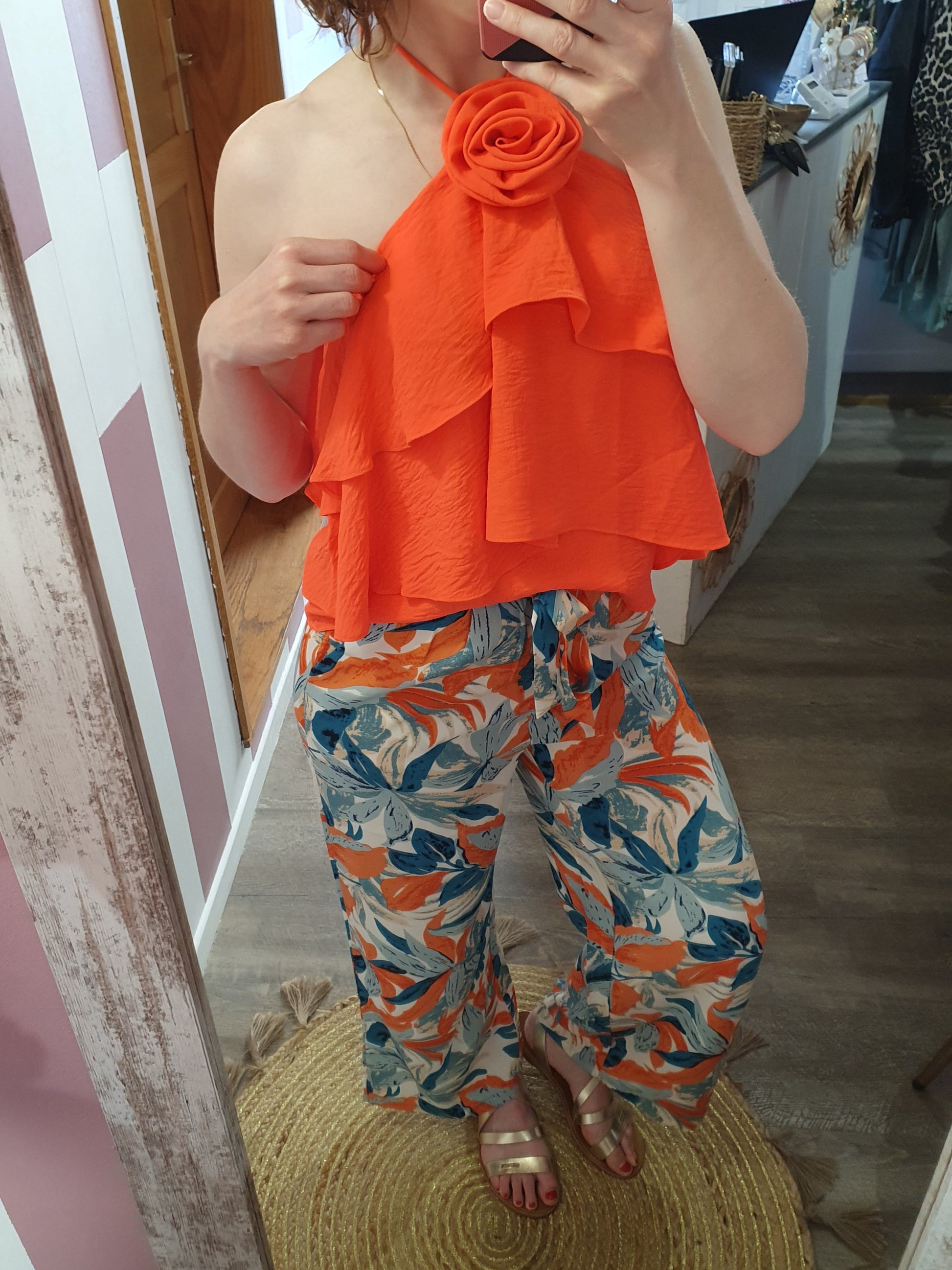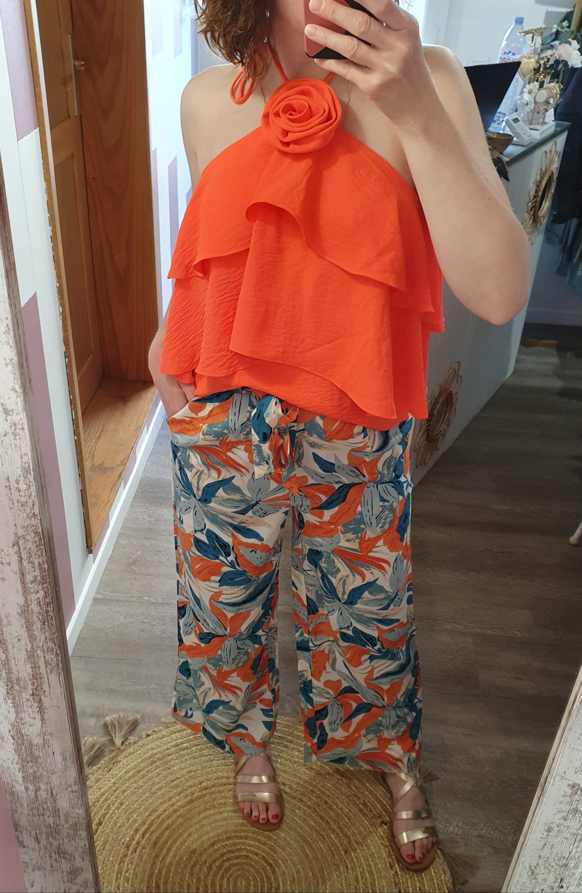 . pantalon fluide à motif feuillage, ceinture élastique avec lien à nouer devant, poches cotés