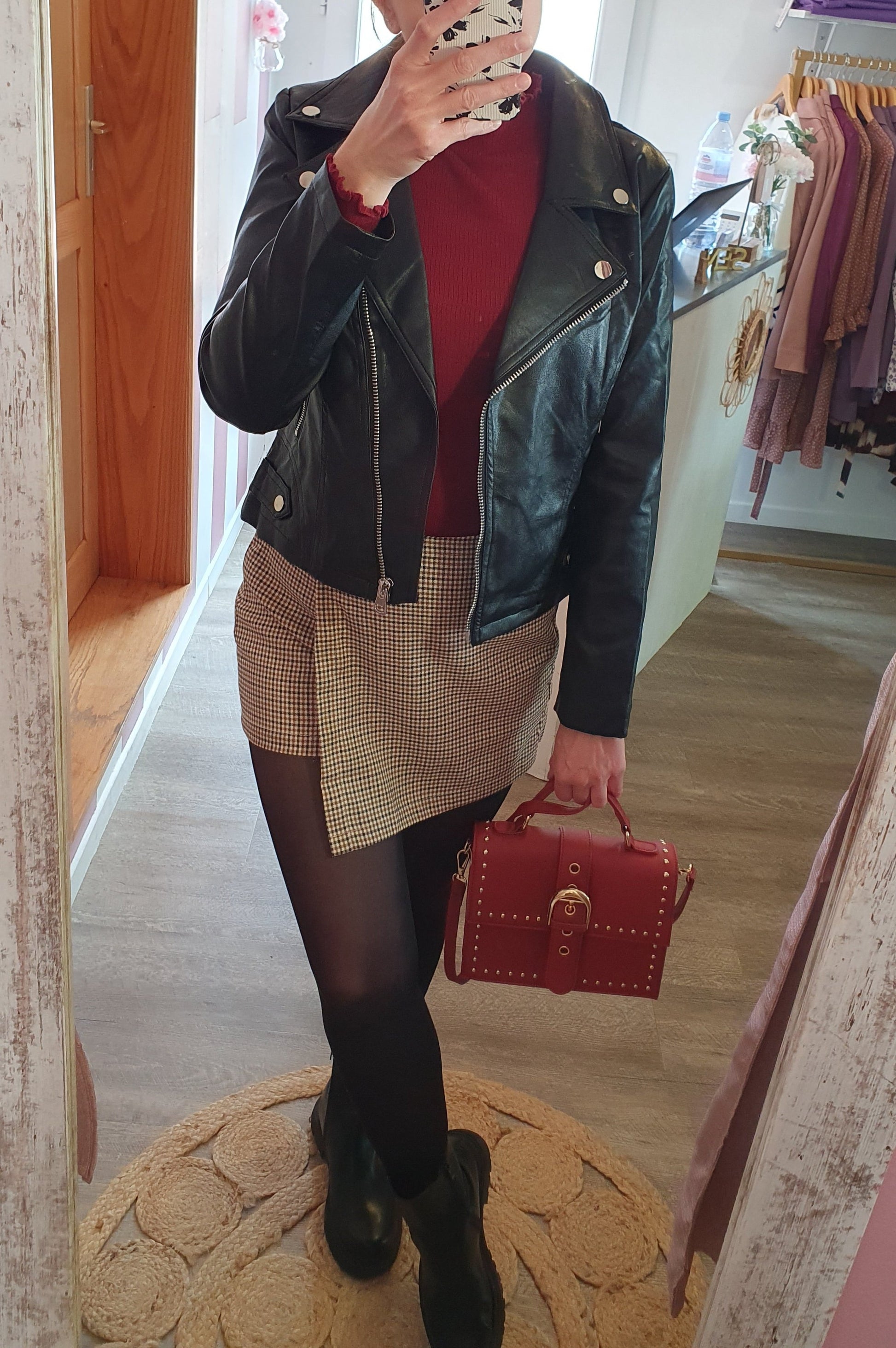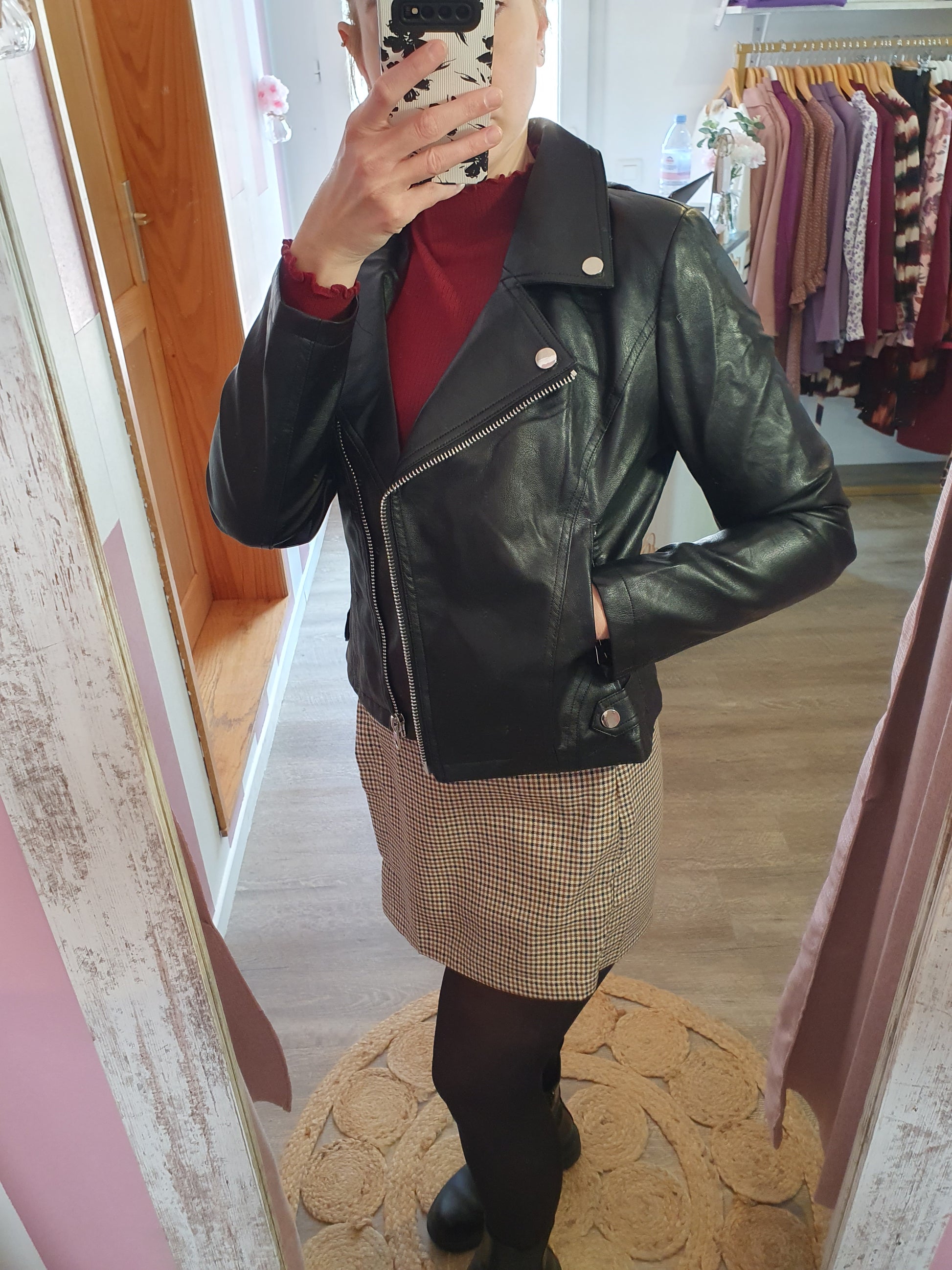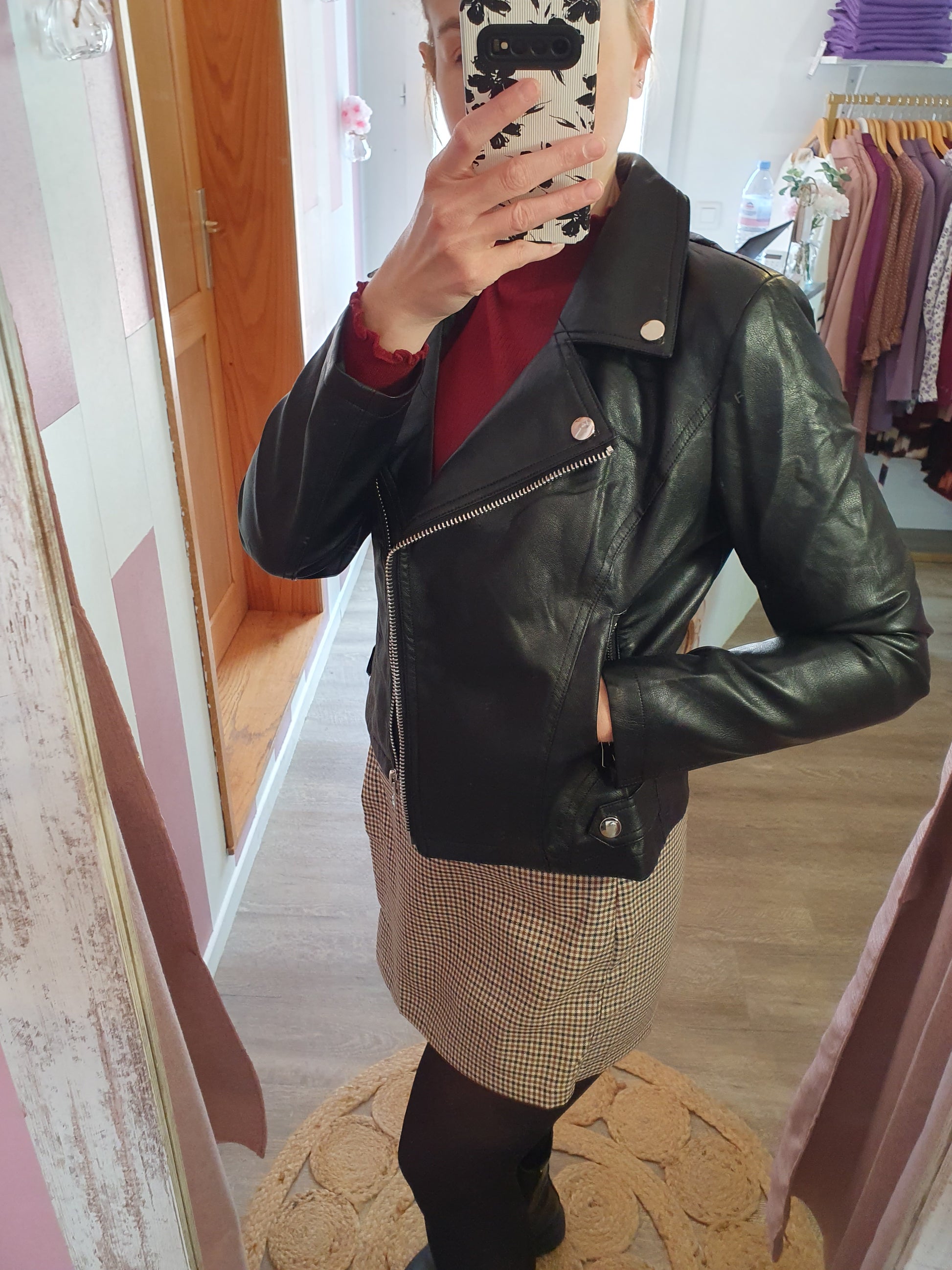 . Perfecto en simili cuir, fermé devant par un zip. Deux poches côtés avec zip