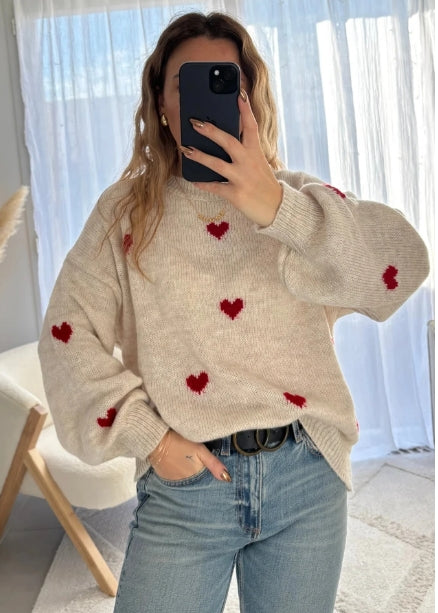 . Maille duveteuse, cœurs contrastés en relief, finitions bords-côtes