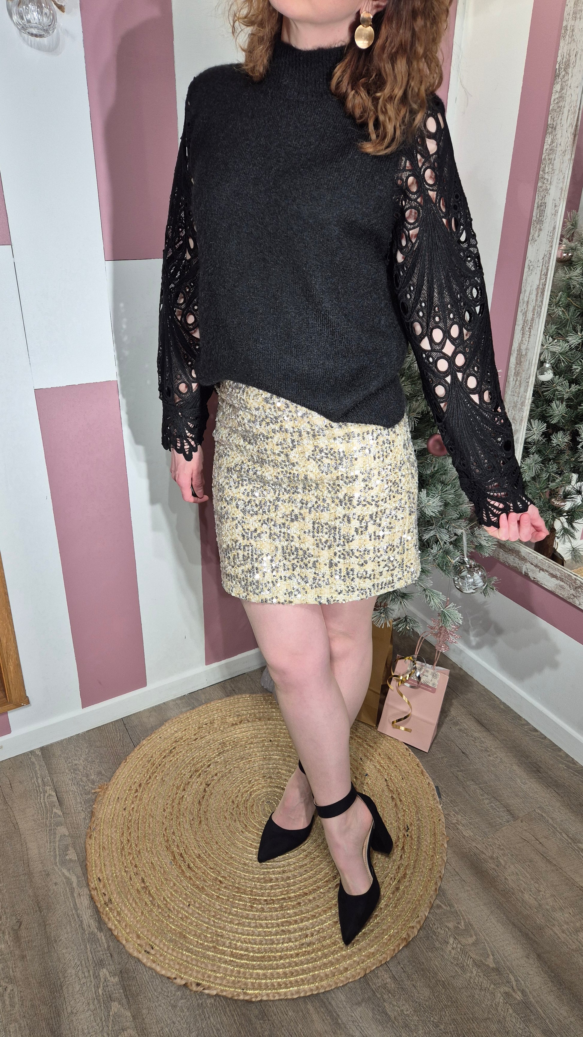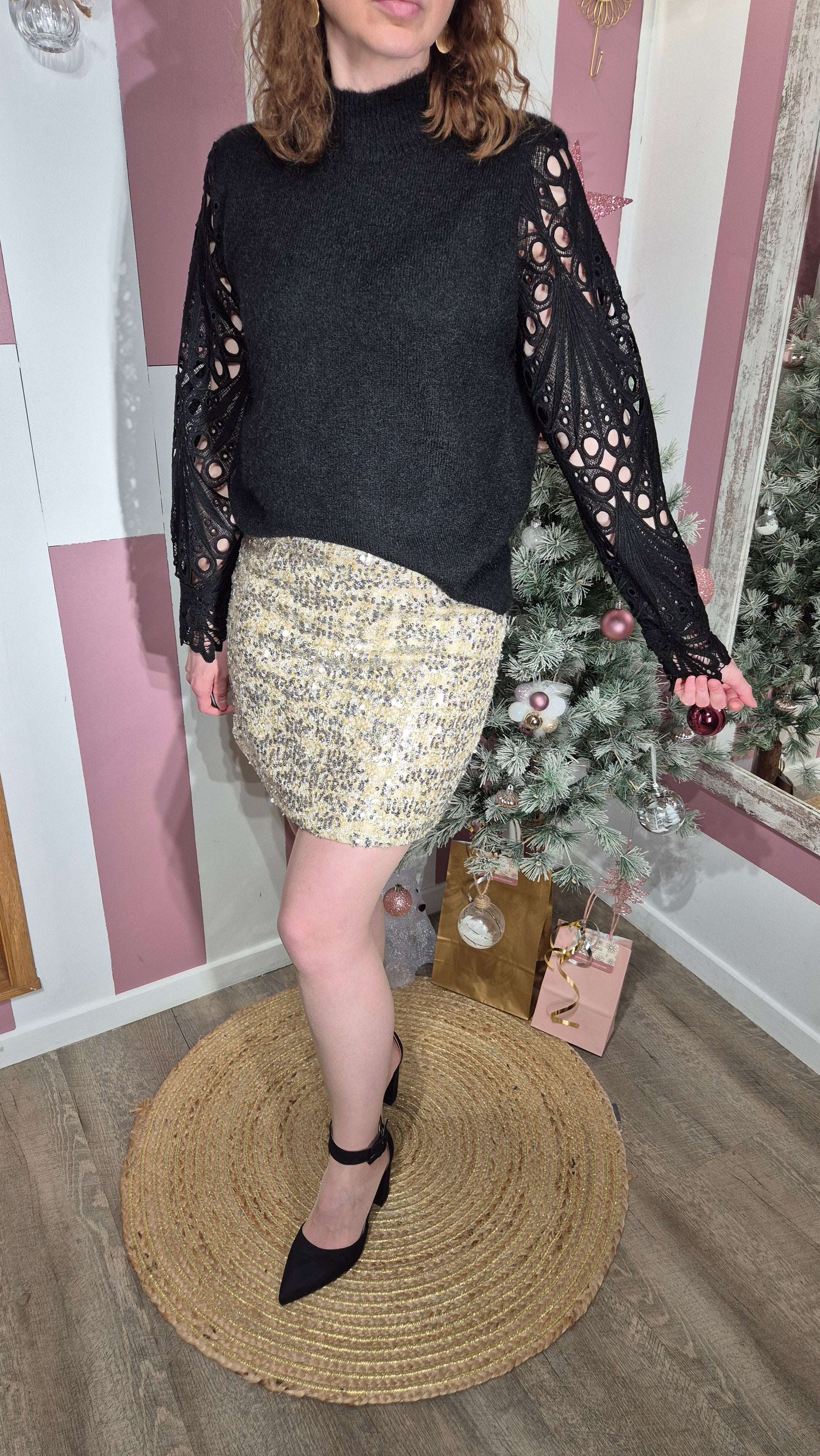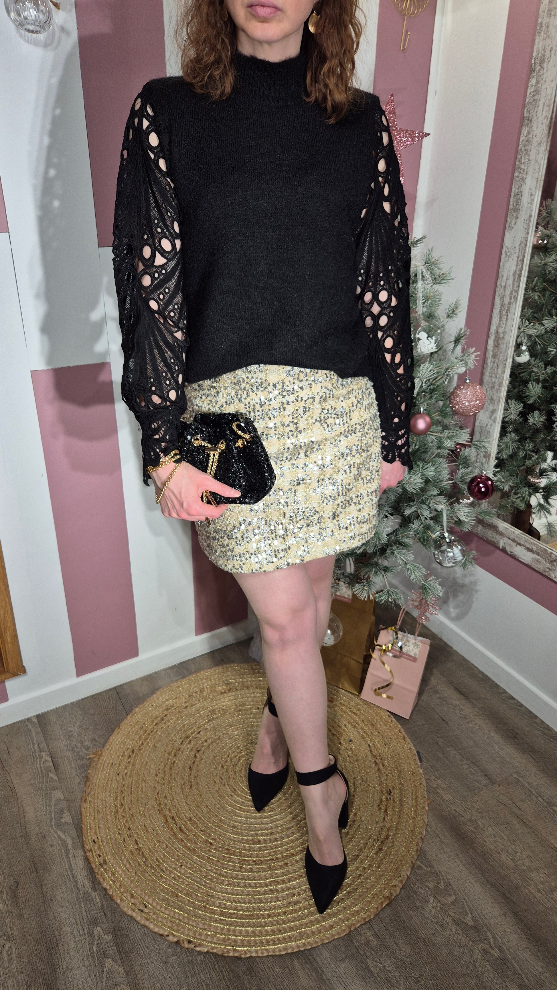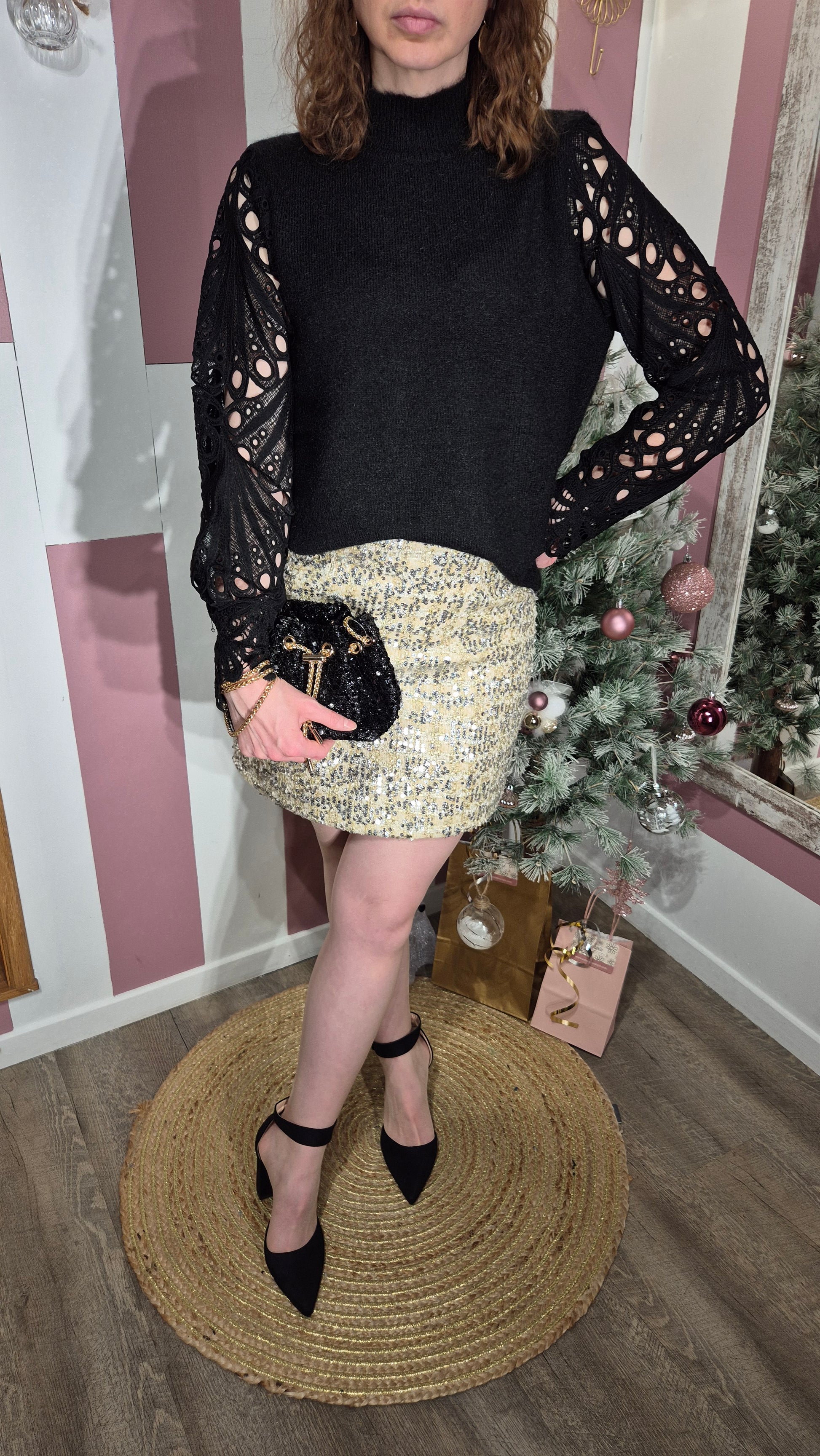 . Le corps du pull est uni noir, en maille tricotée douce, légèrement duveteuse.