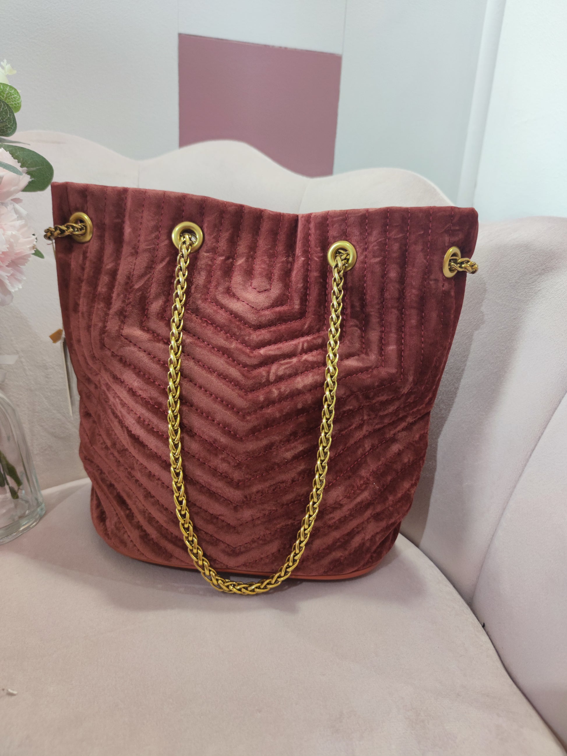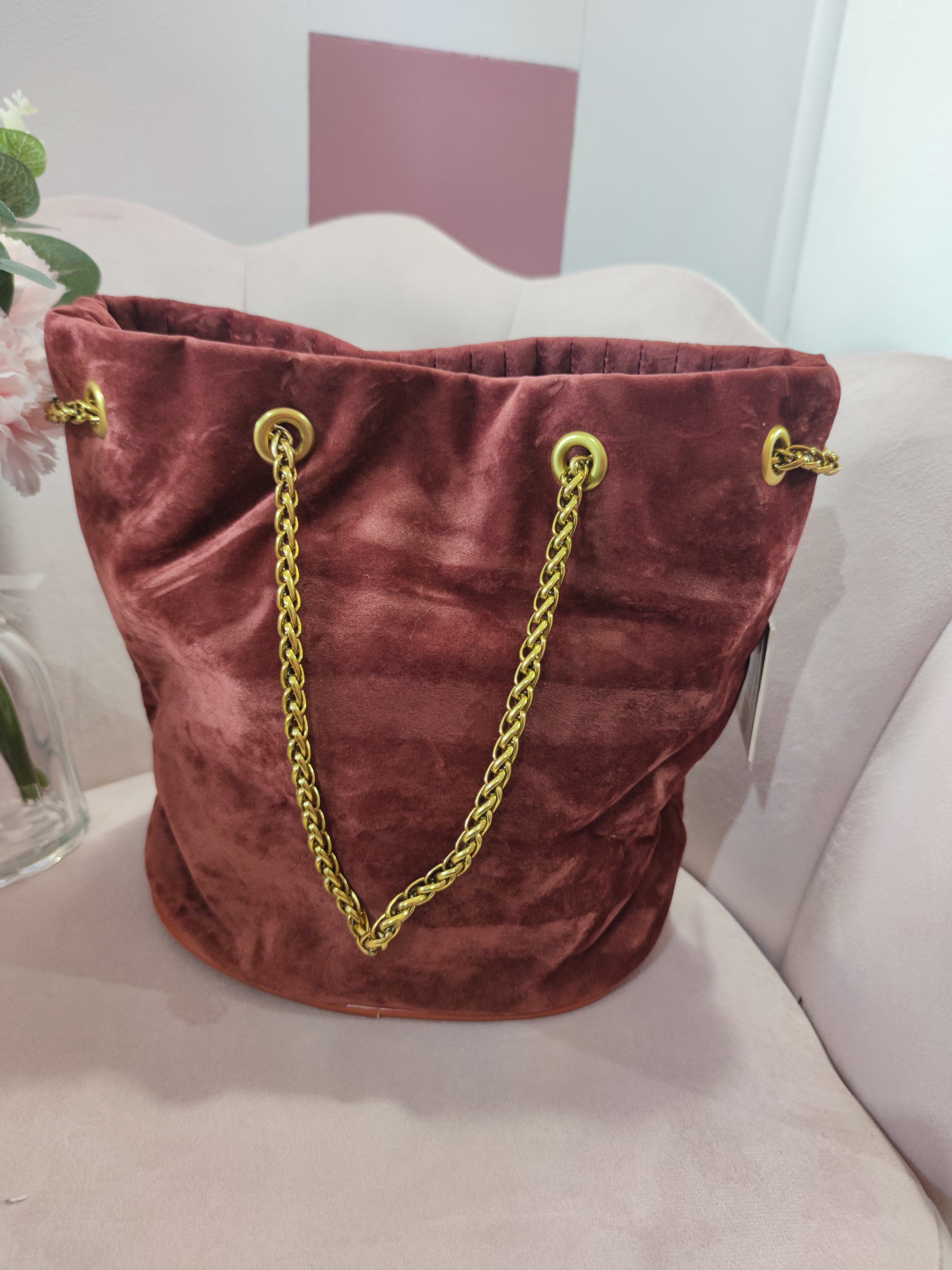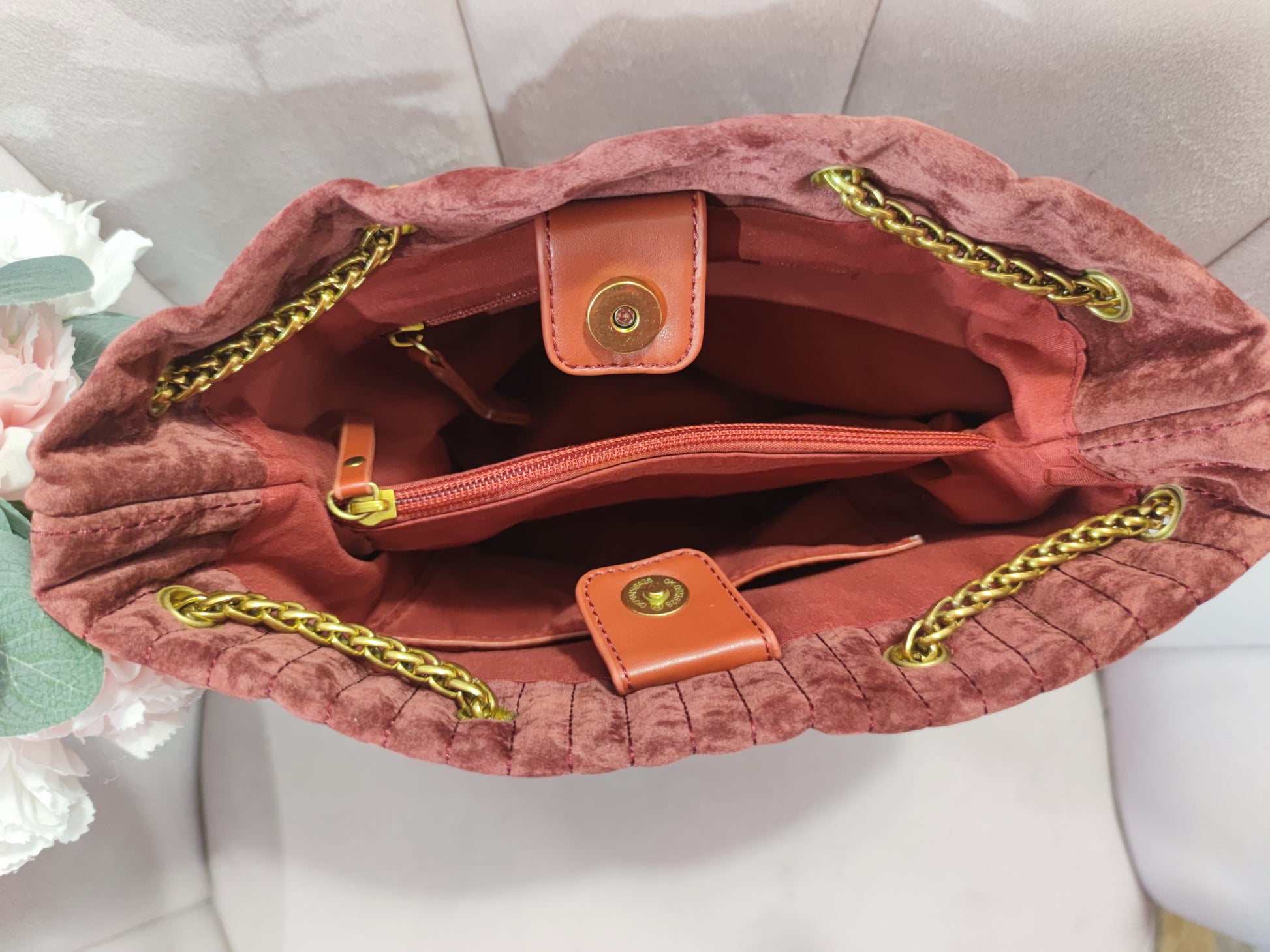 . Fermeture par un bouton pression et une chaîne dorée coulissante. Cette dernière peut se porter d'un côté en une anse ou bien en deux.