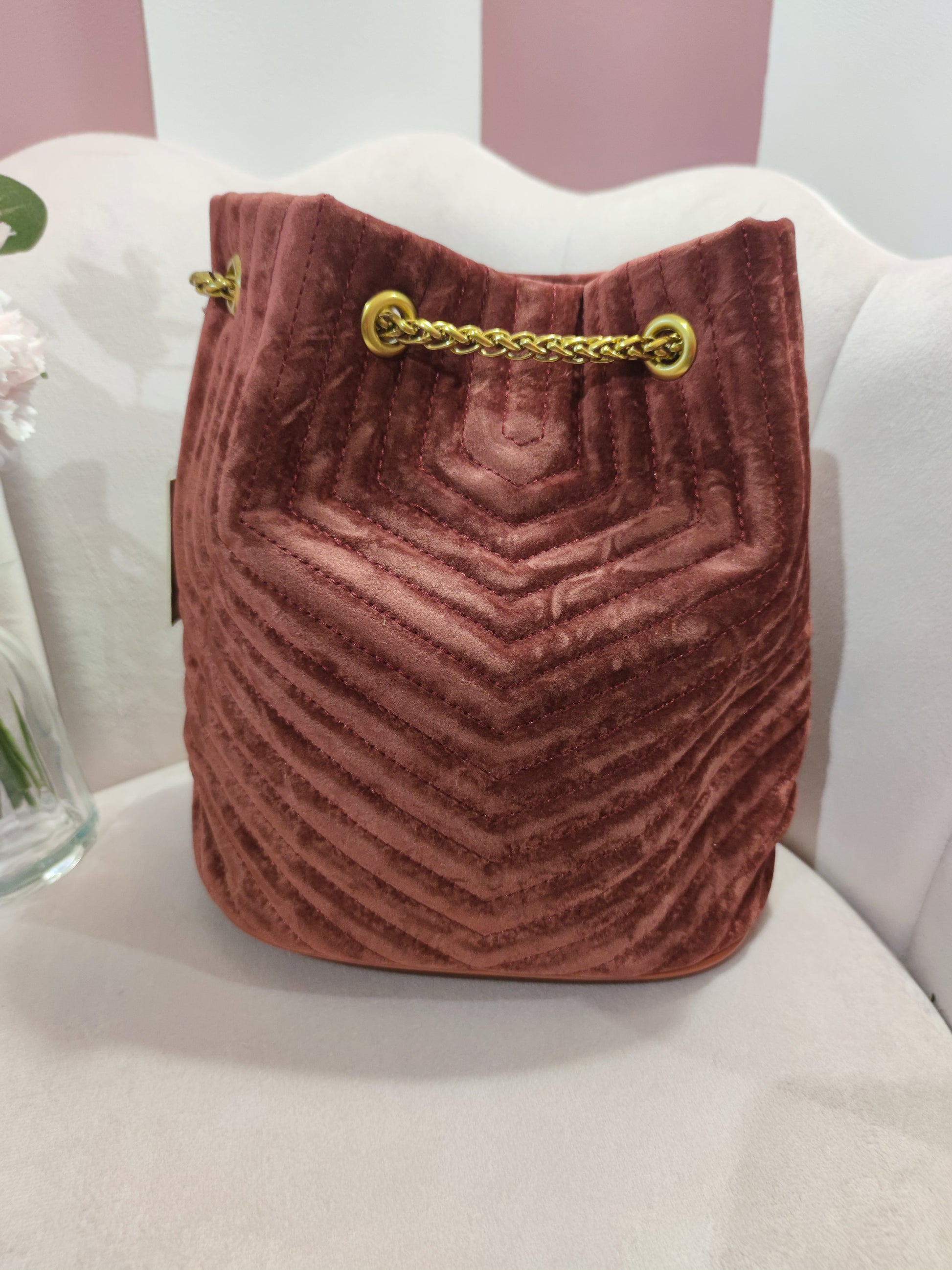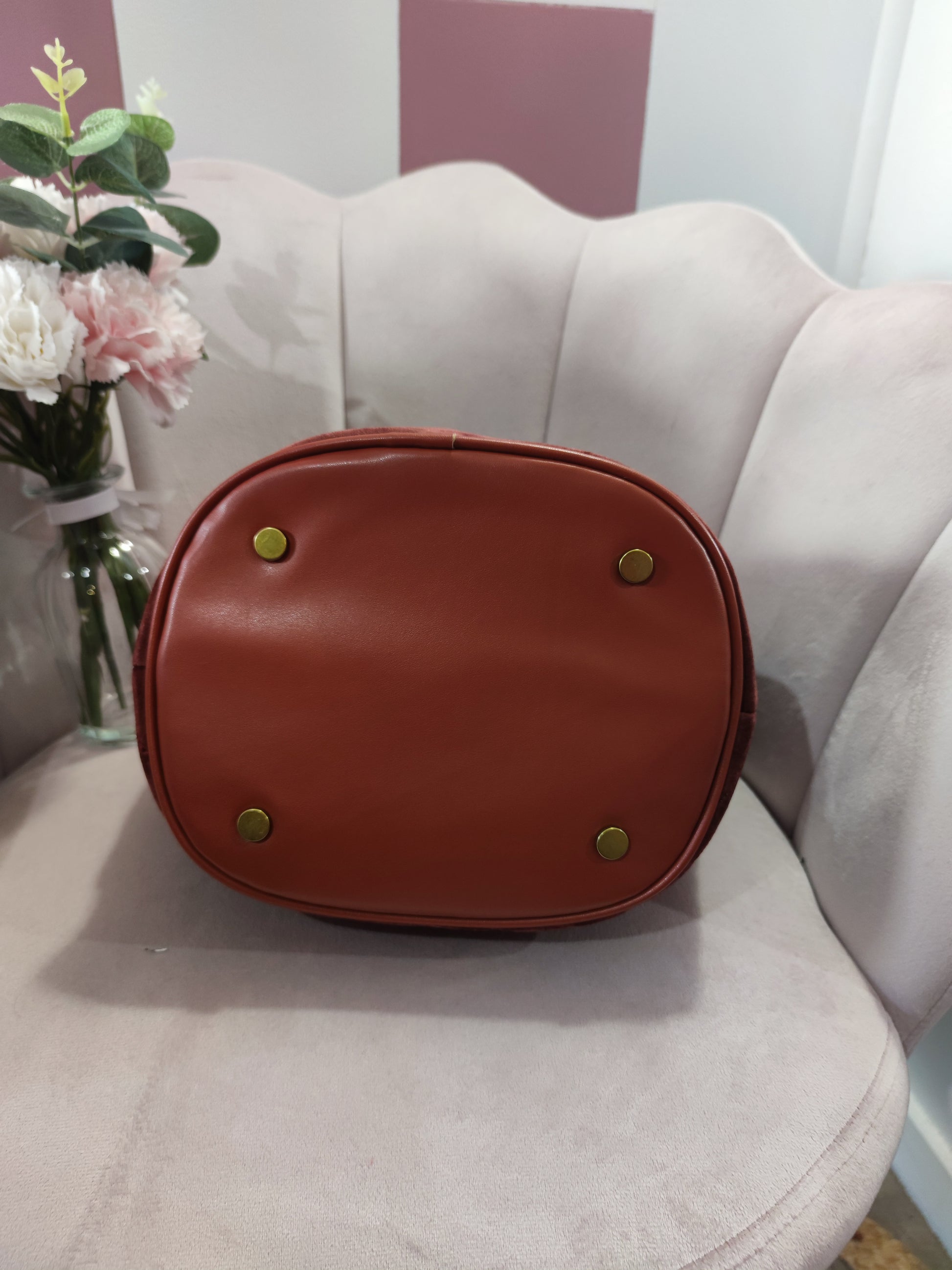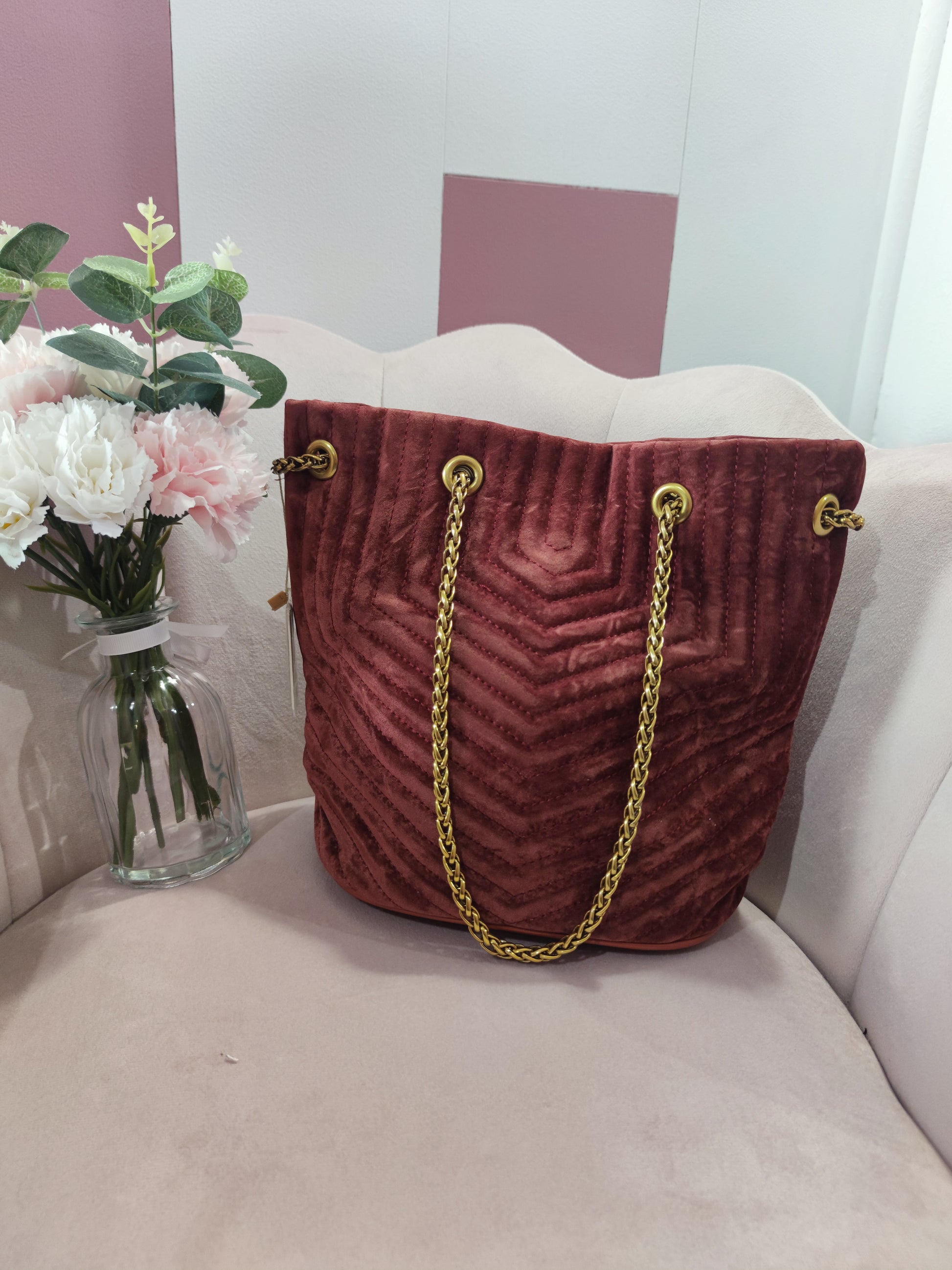 . Fermeture par un bouton pression et une chaîne dorée coulissante. Cette dernière peut se porter d'un côté en une anse ou bien en deux.