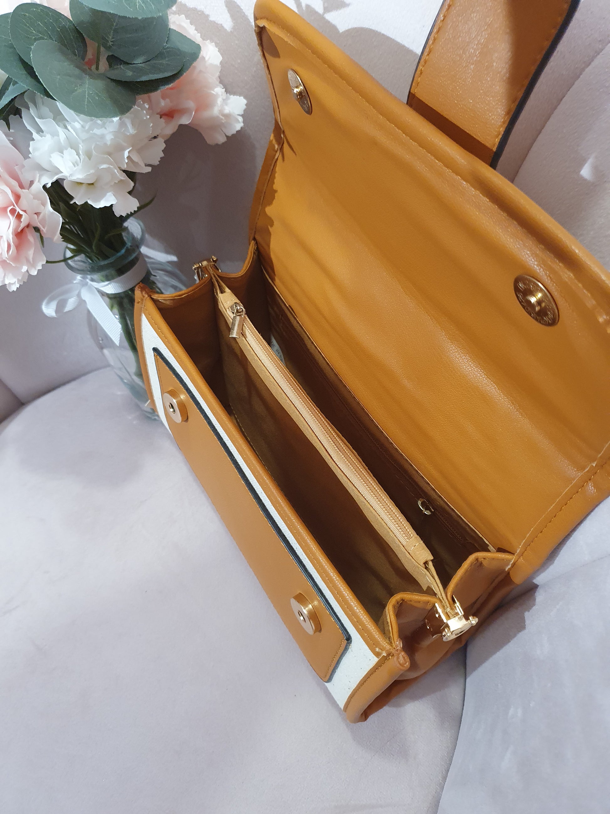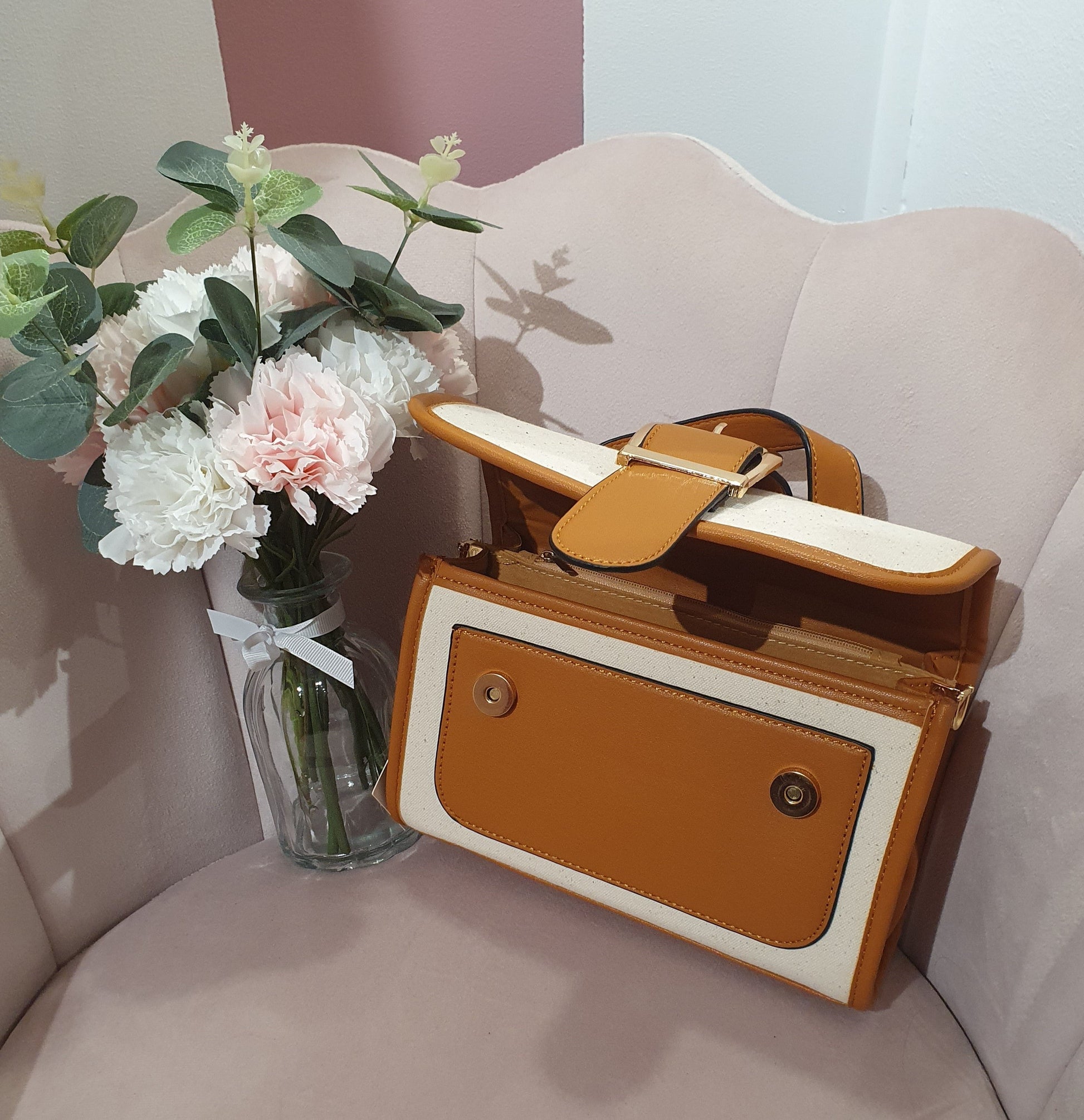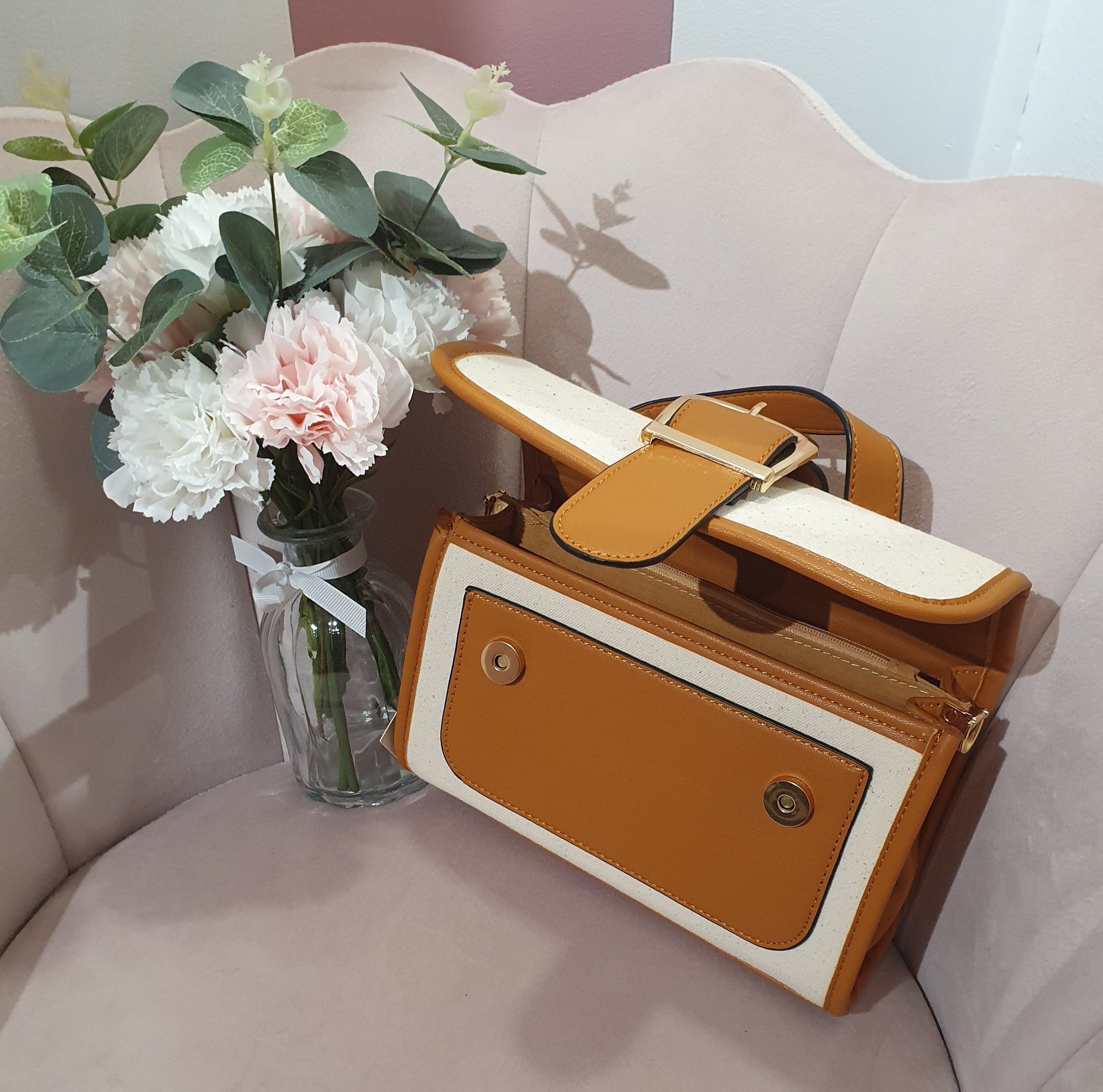 . Sac bi matière simili cuir camel / tissu moucheté beige