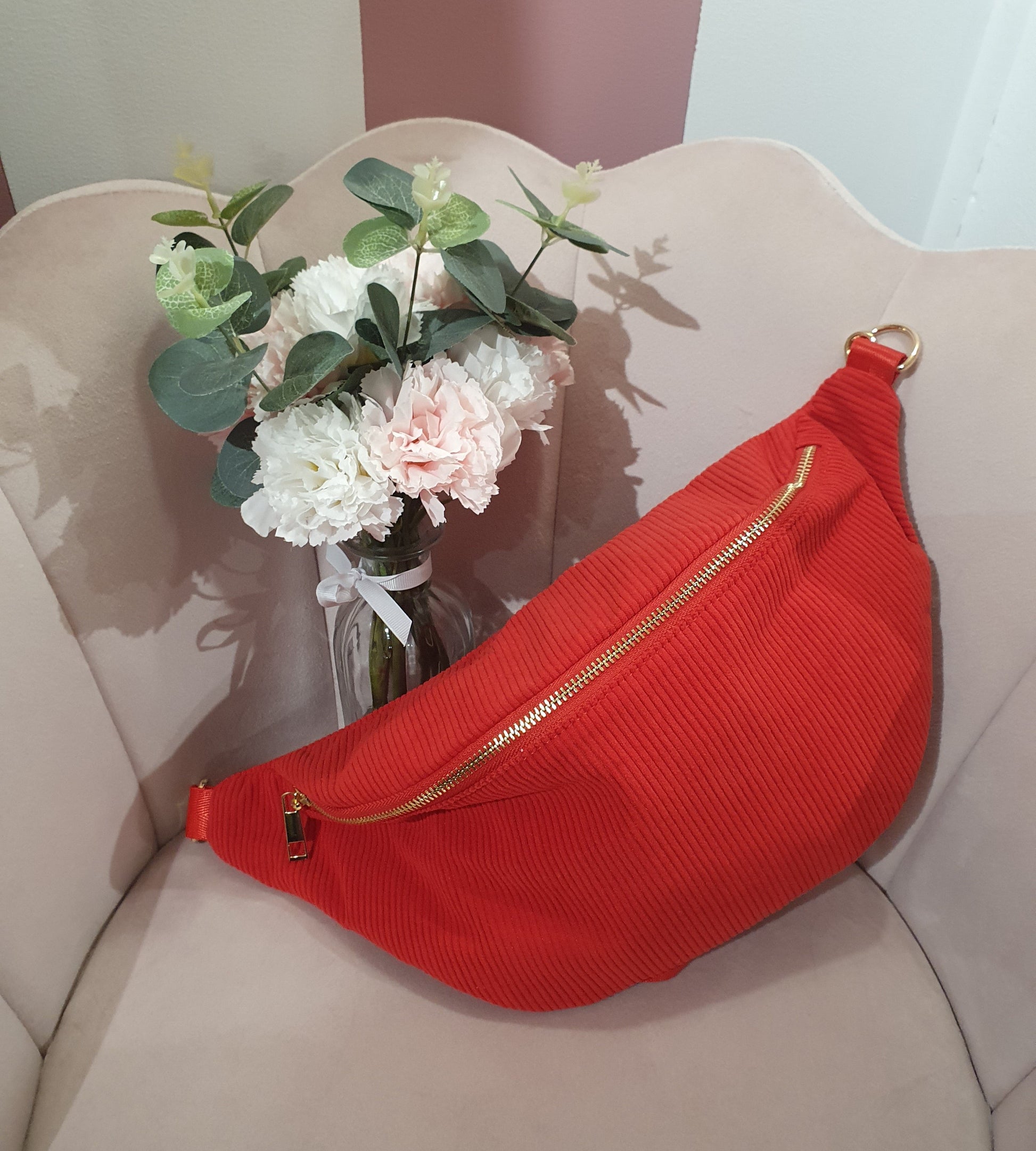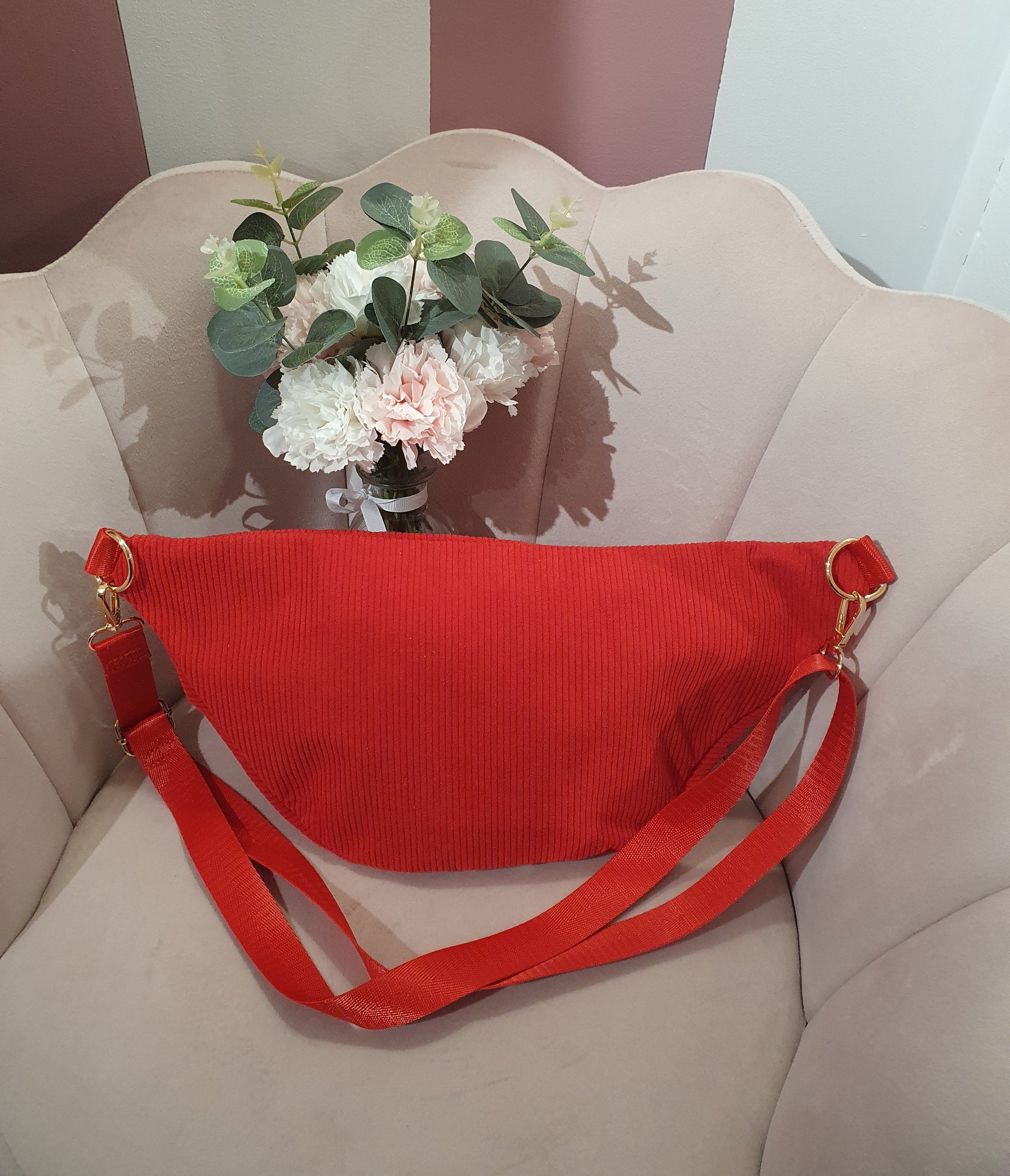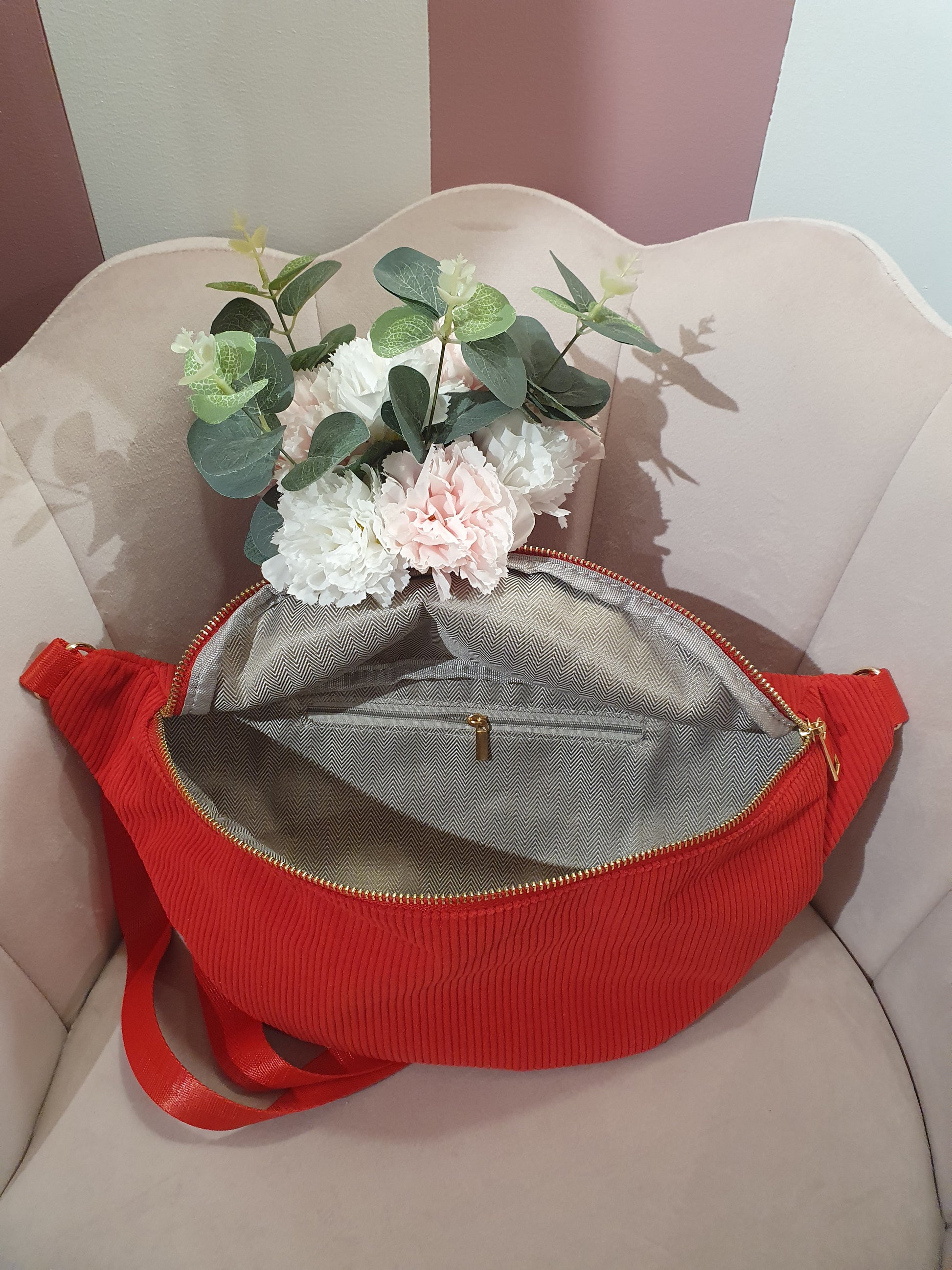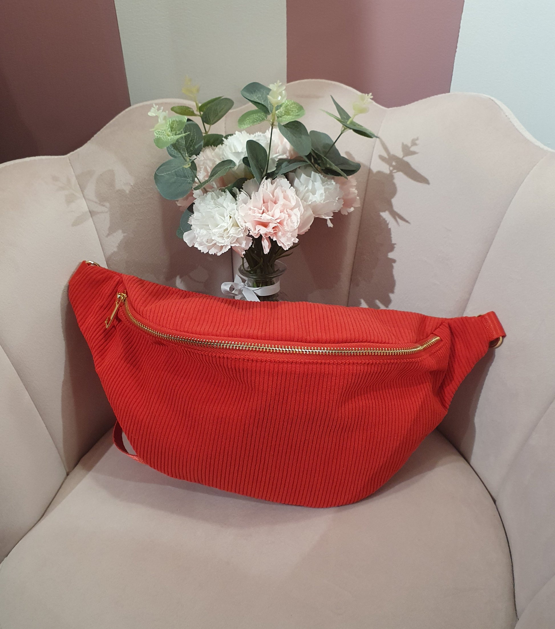 . Sac banane extérieur velours côtelé rouge et intérieur tissu rayé noir et blanc