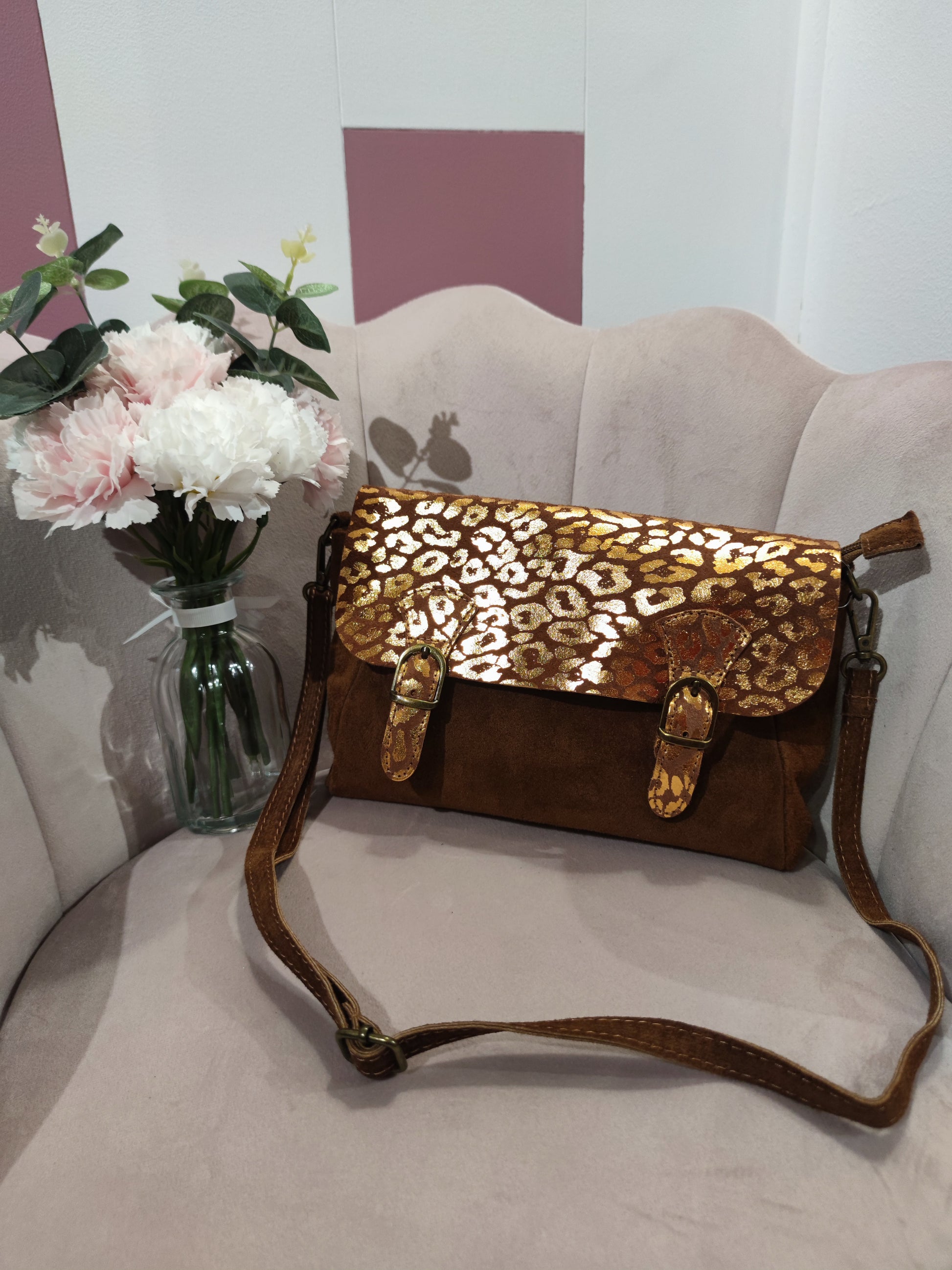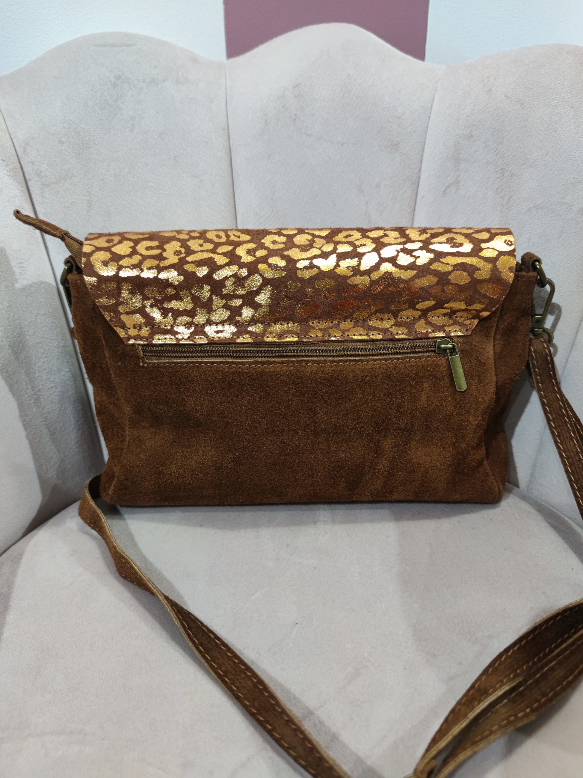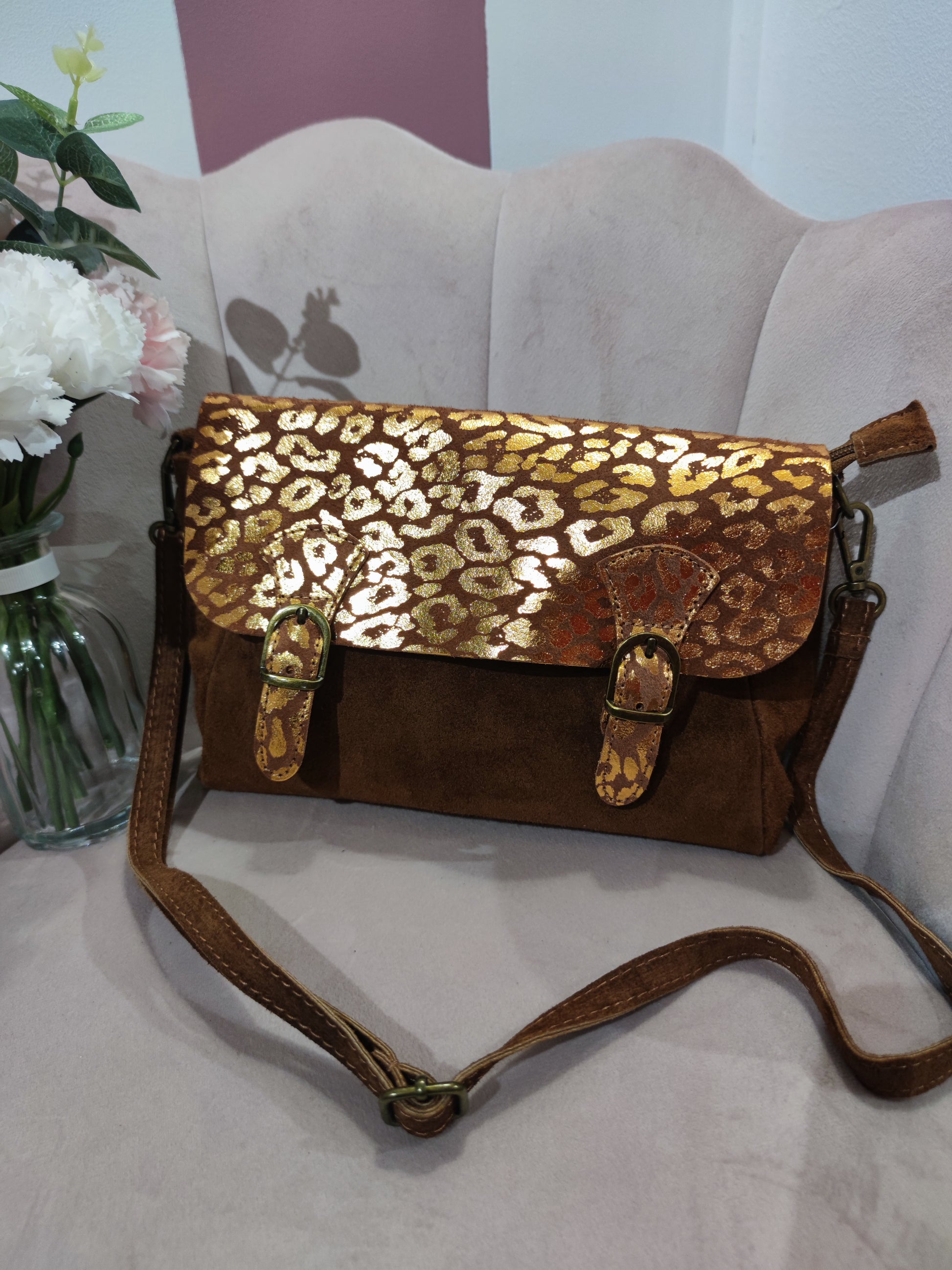 . Sac en croûte de cuir bi couleur, Camel Uni sur le bas du sac et imprimés léopard doré sur le haut