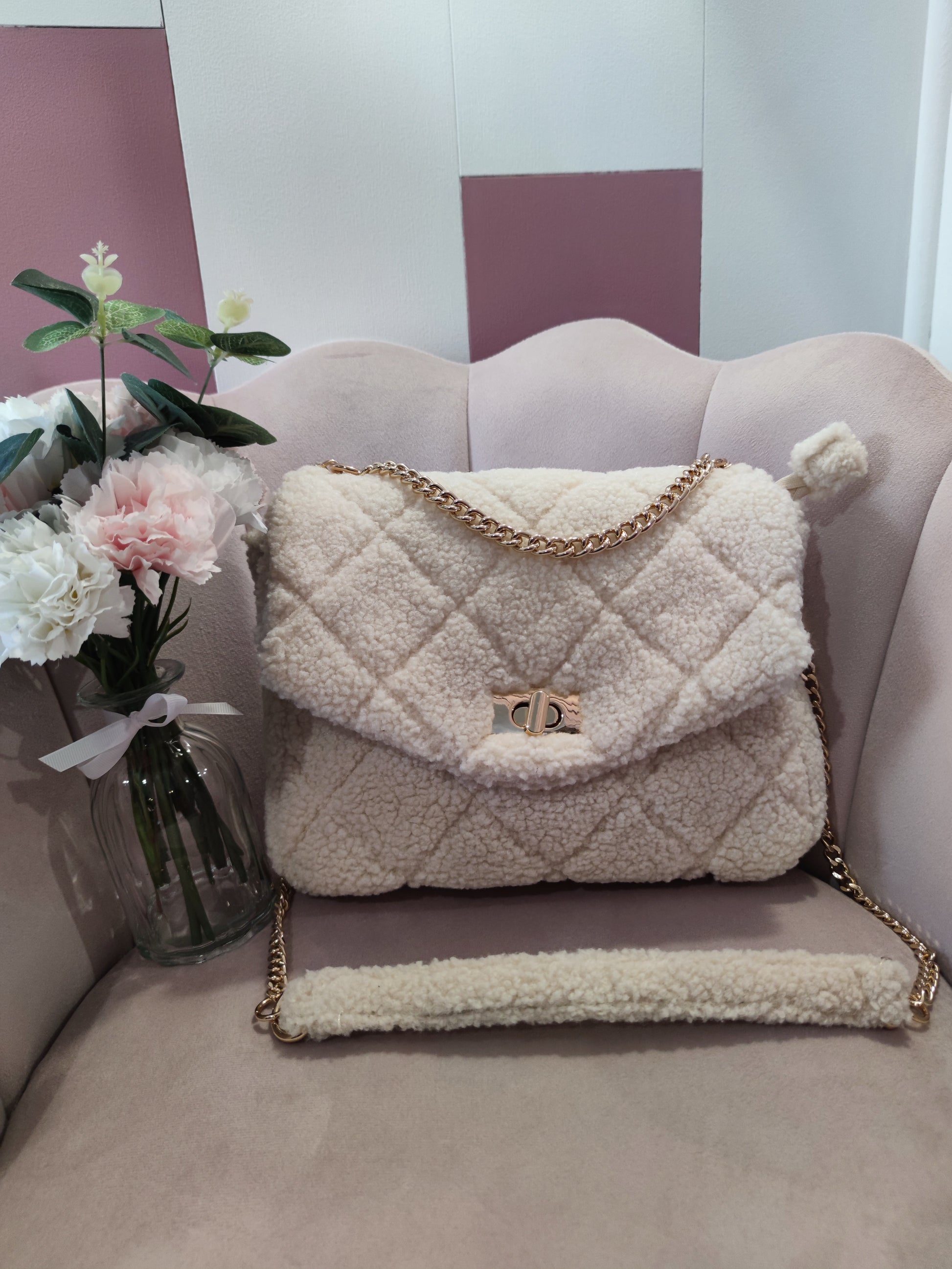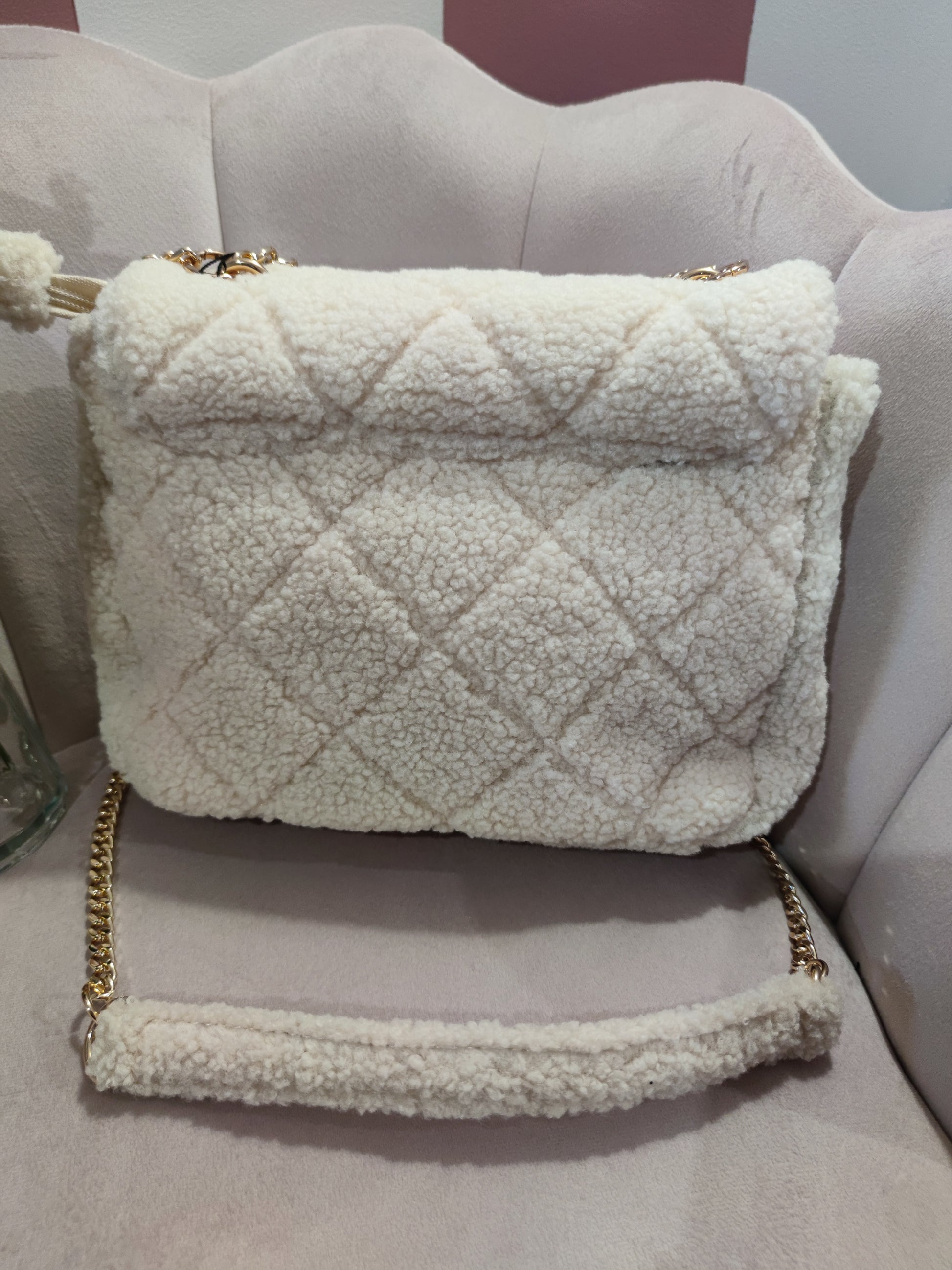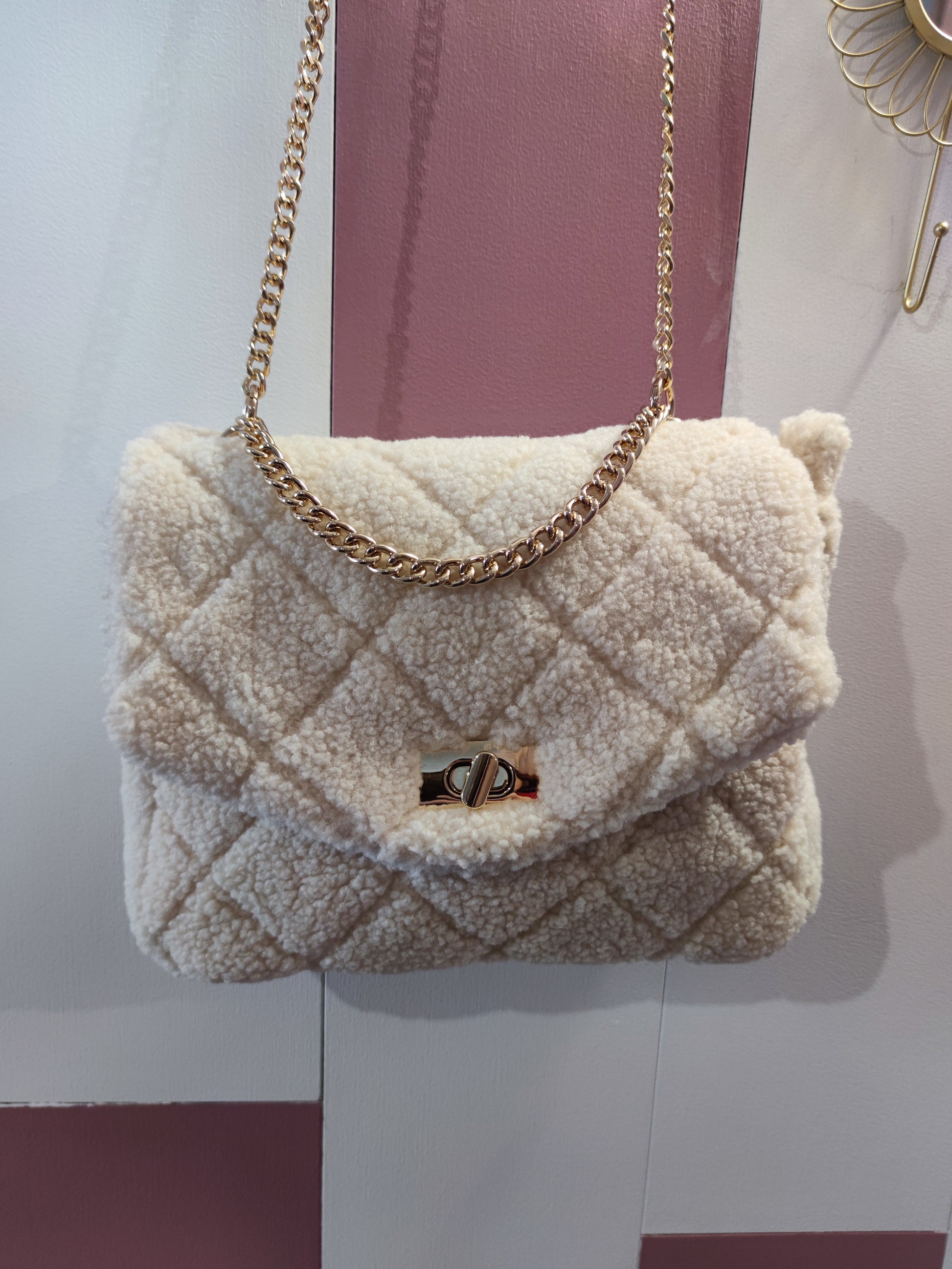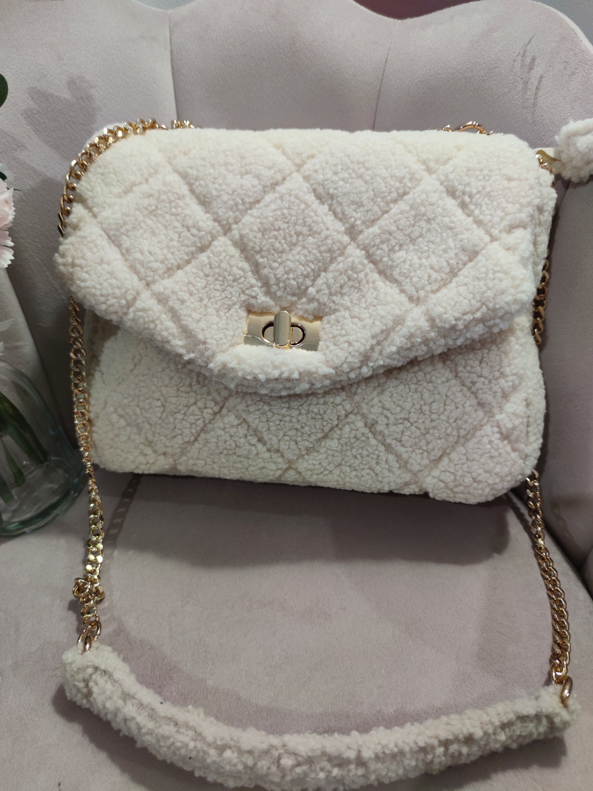 . Sac très doux avec une anse en or, en tissu fausse fourrure mouton à motif losange en relief.