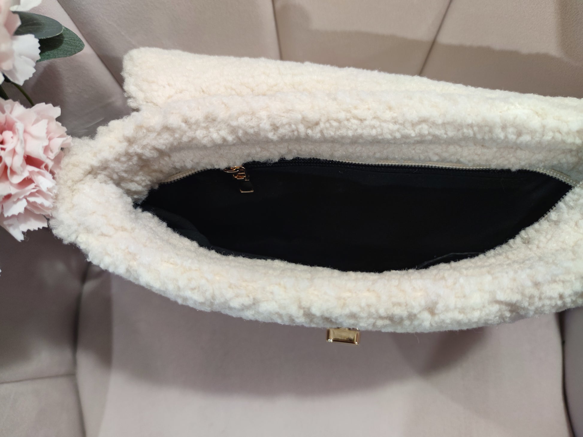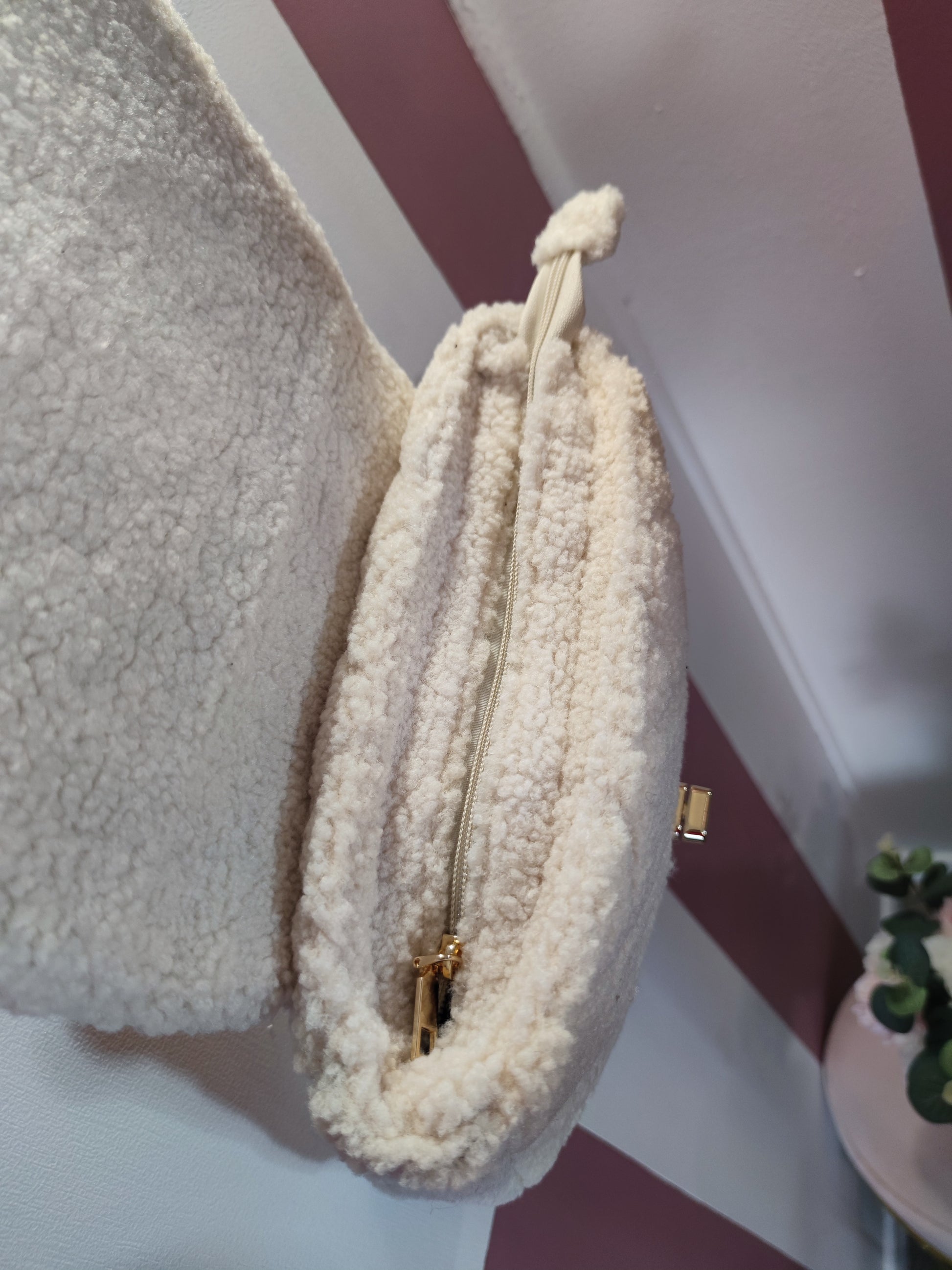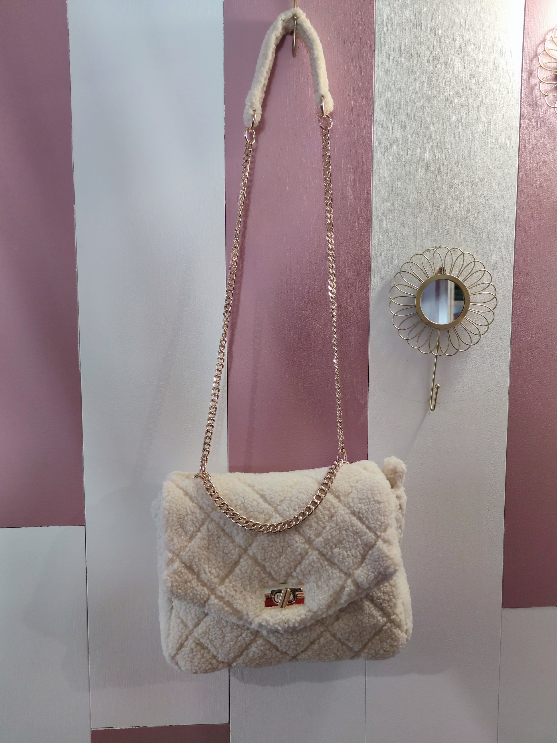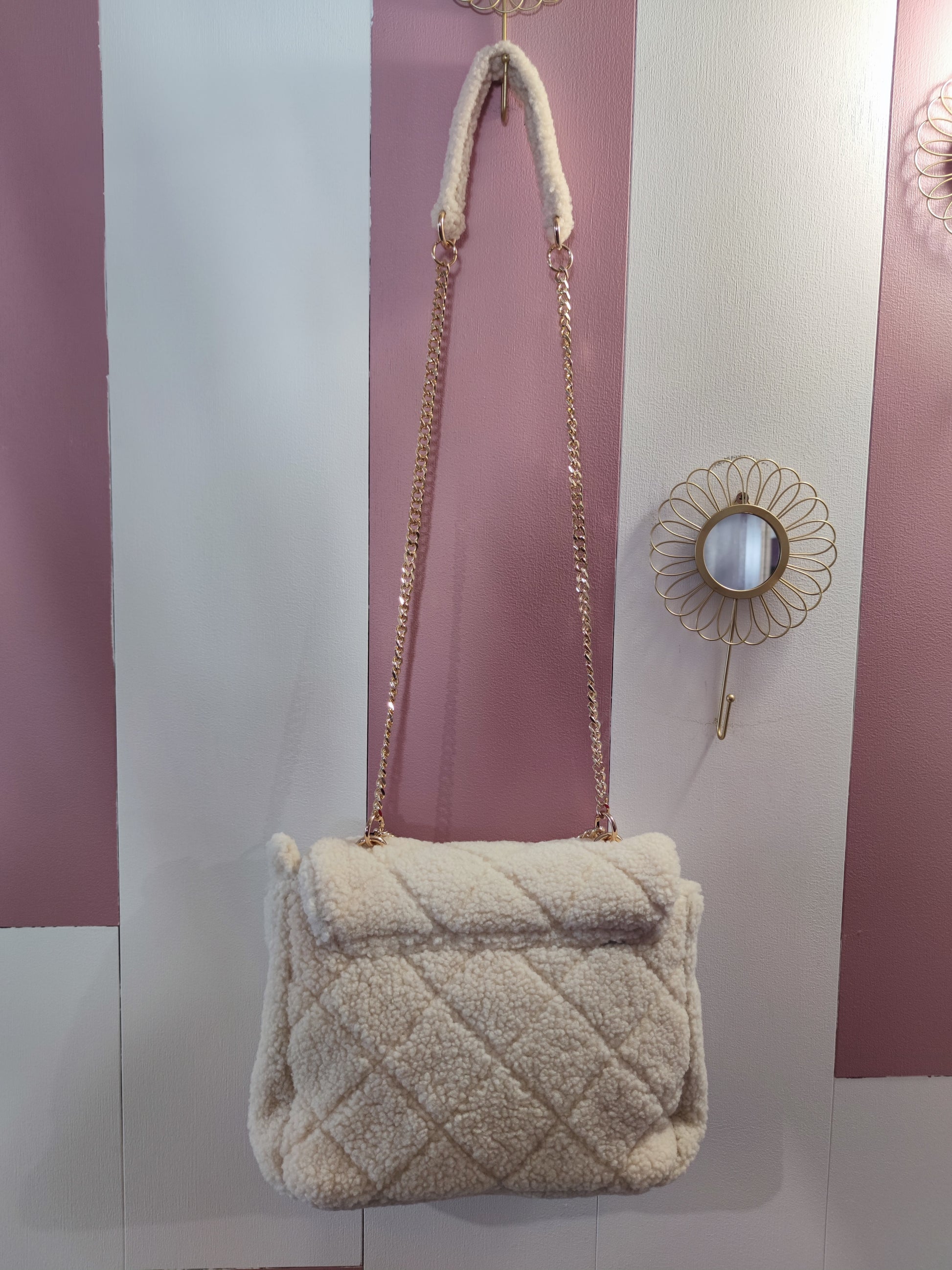 . Sac très doux avec une anse en or, en tissu fausse fourrure mouton à motif losange en relief.