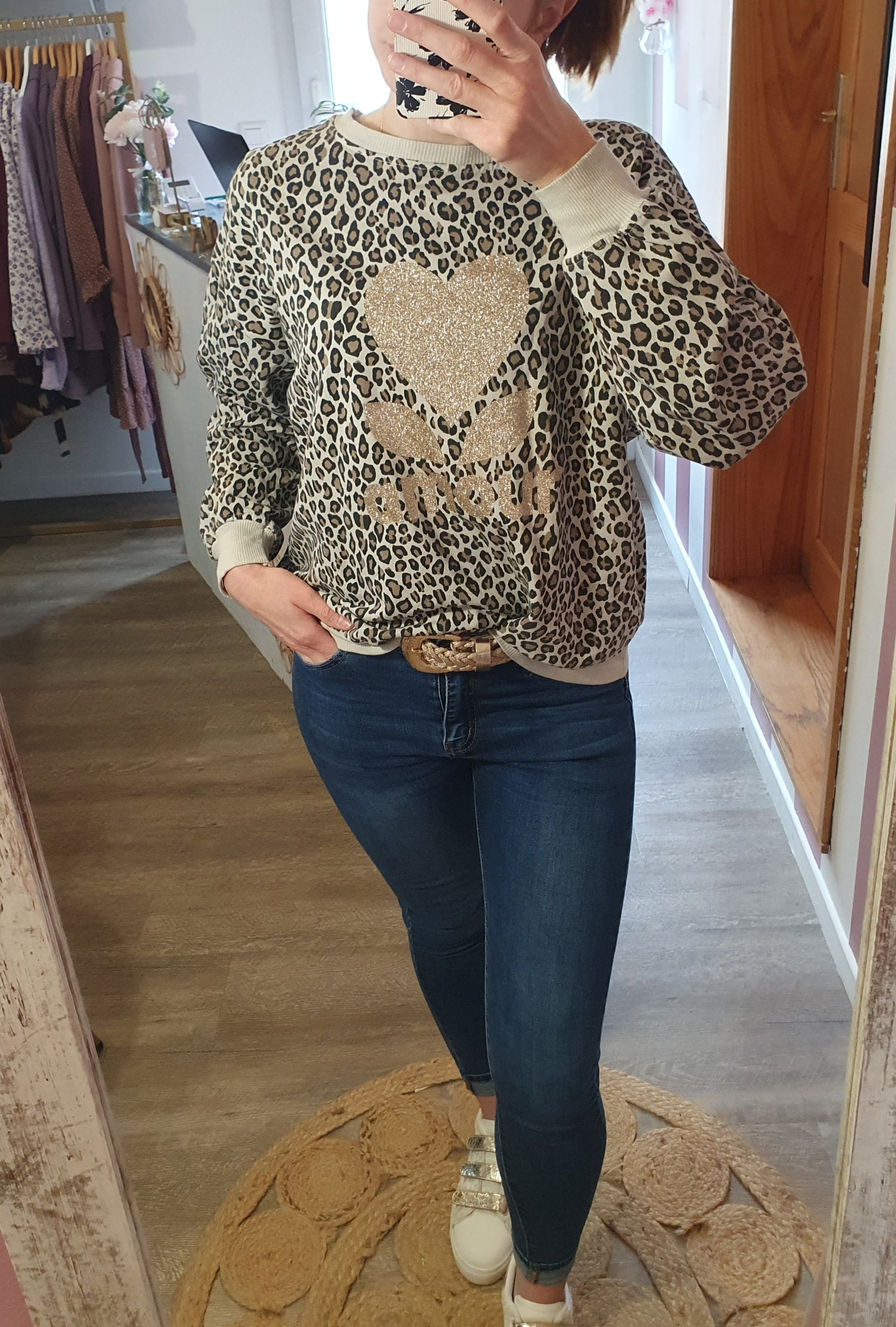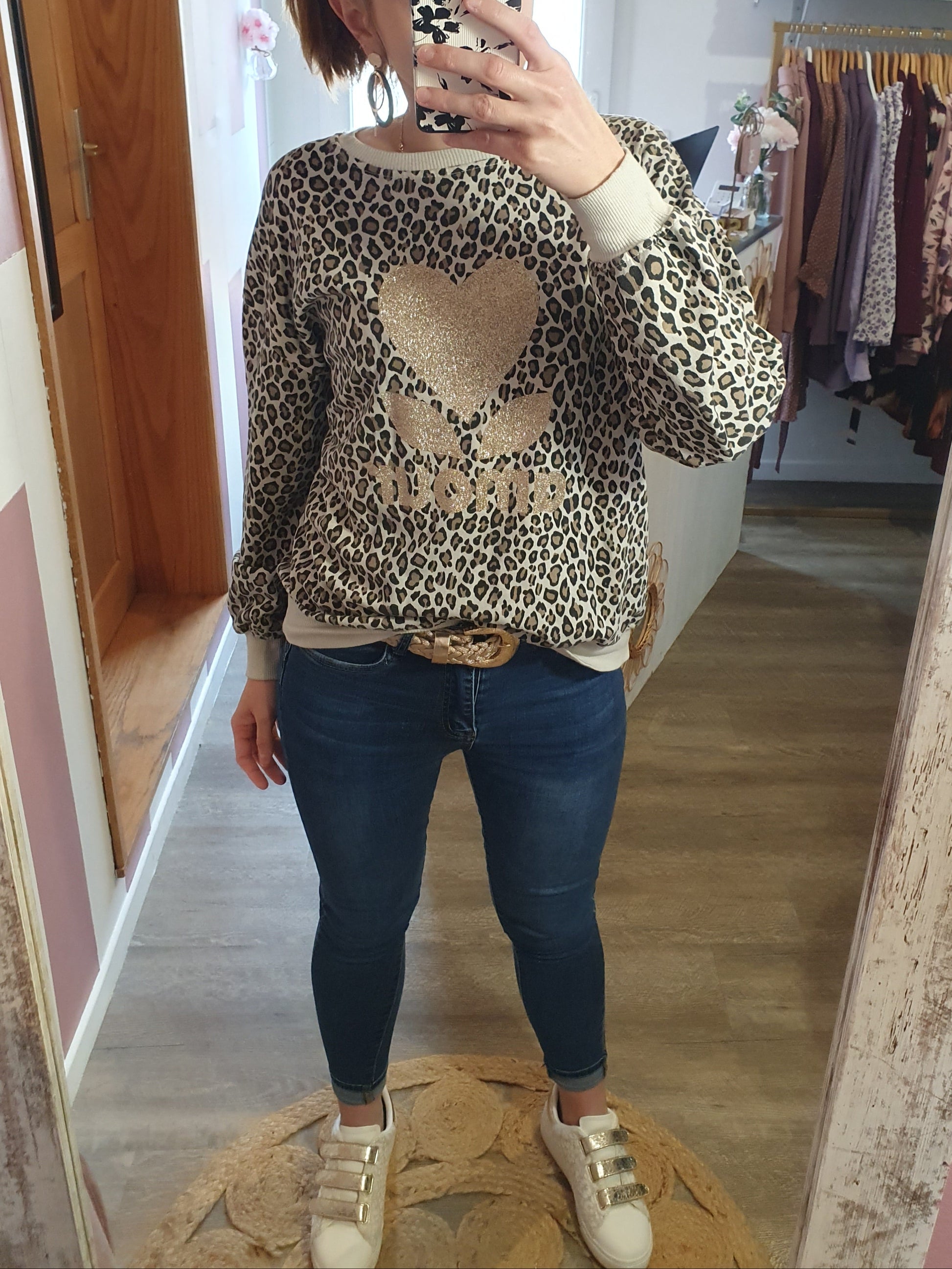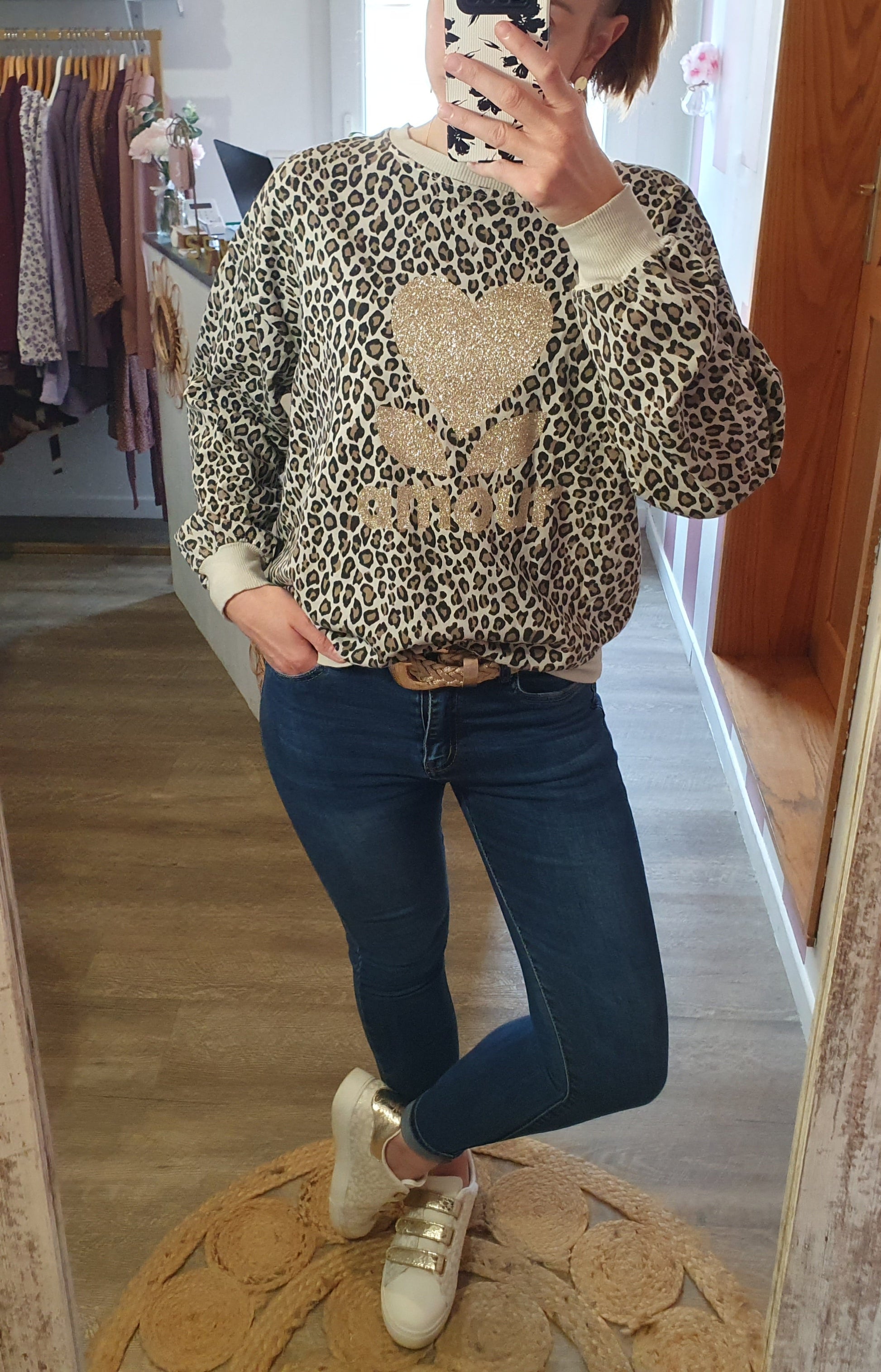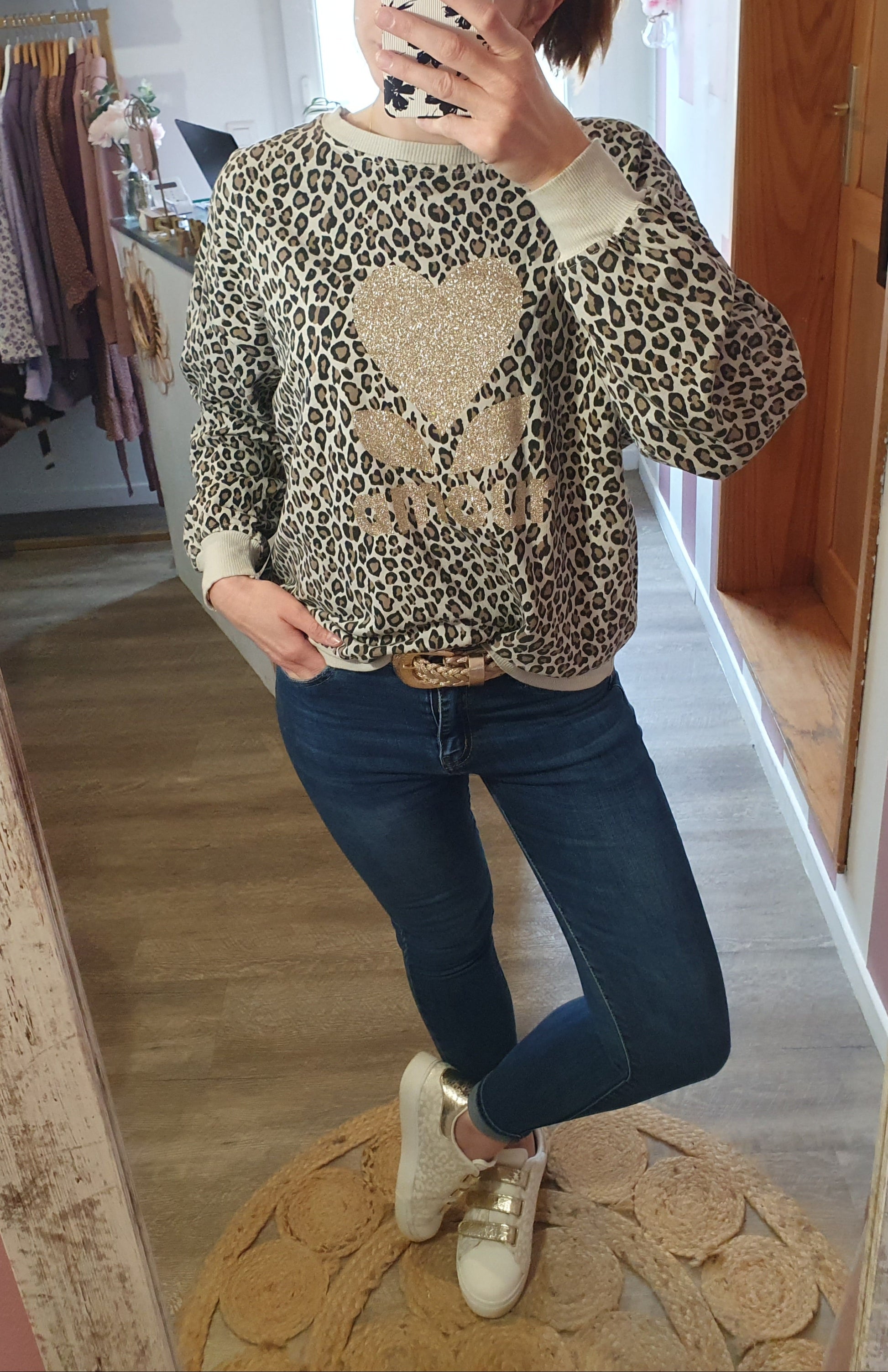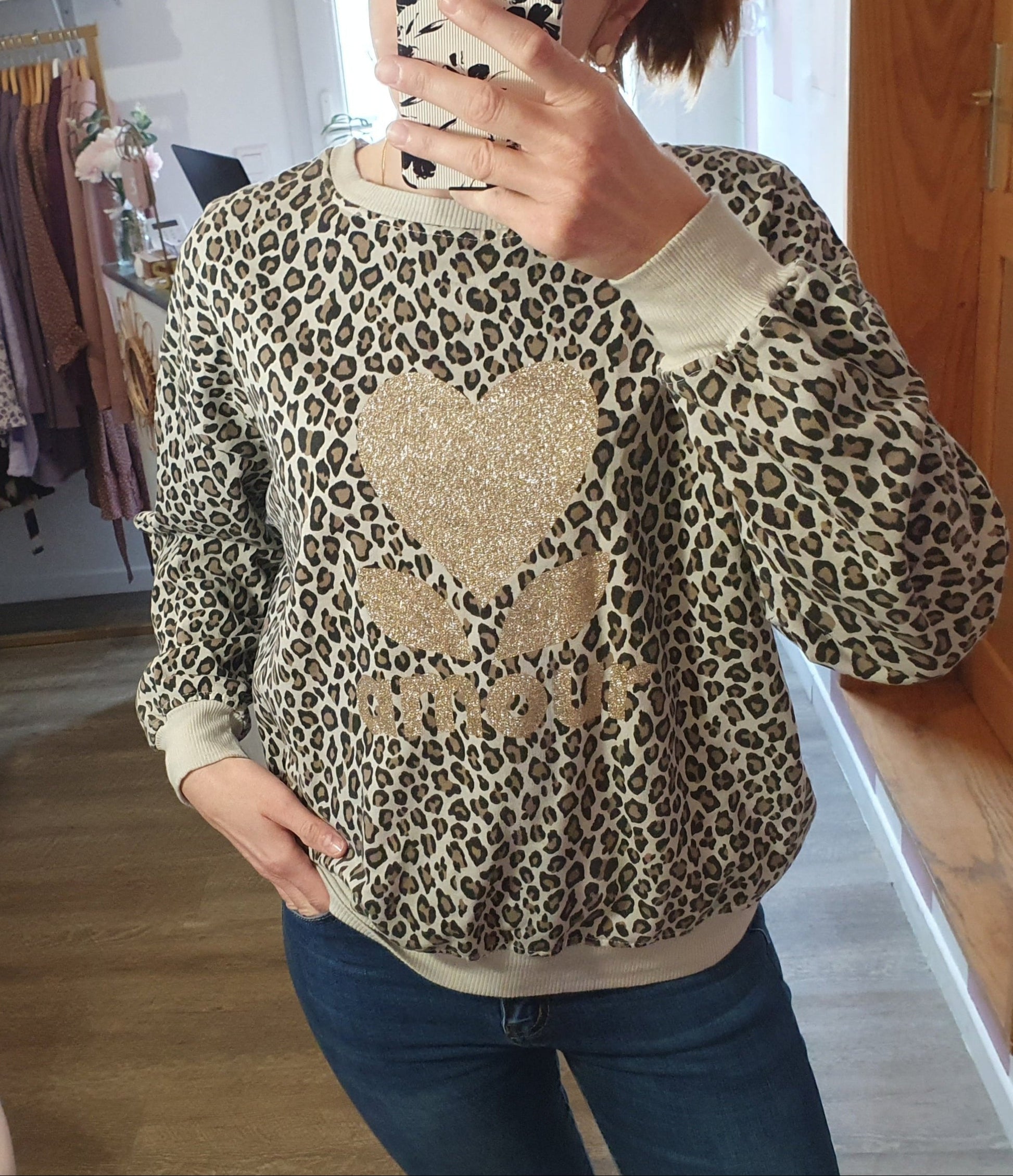 . Sweat écru et taupe à imprimé Léopard, inscription doré " Amour" , gros cœur doré