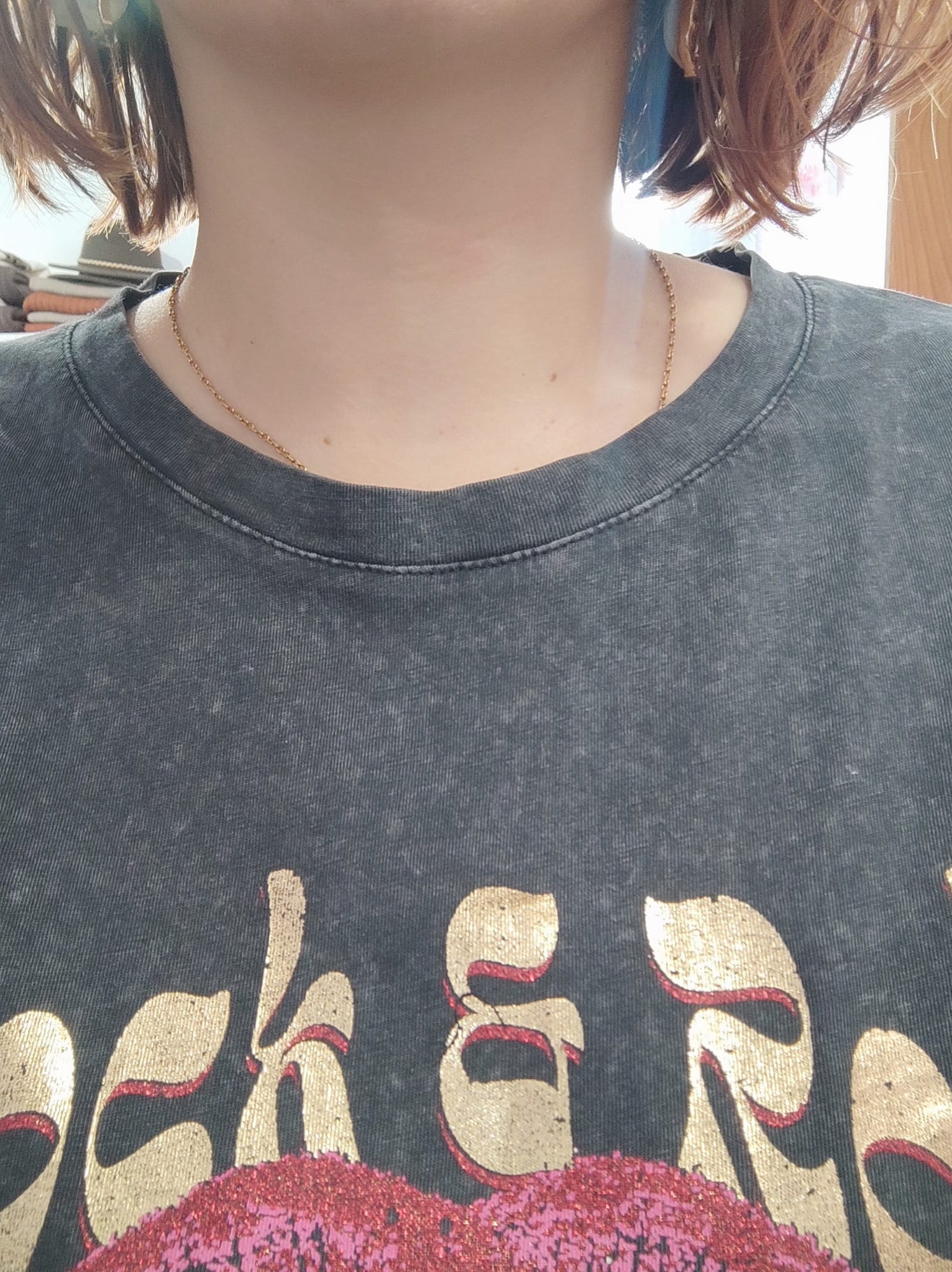 . Motif poitrine bouche rose, inscription doré " Rock and Roll"