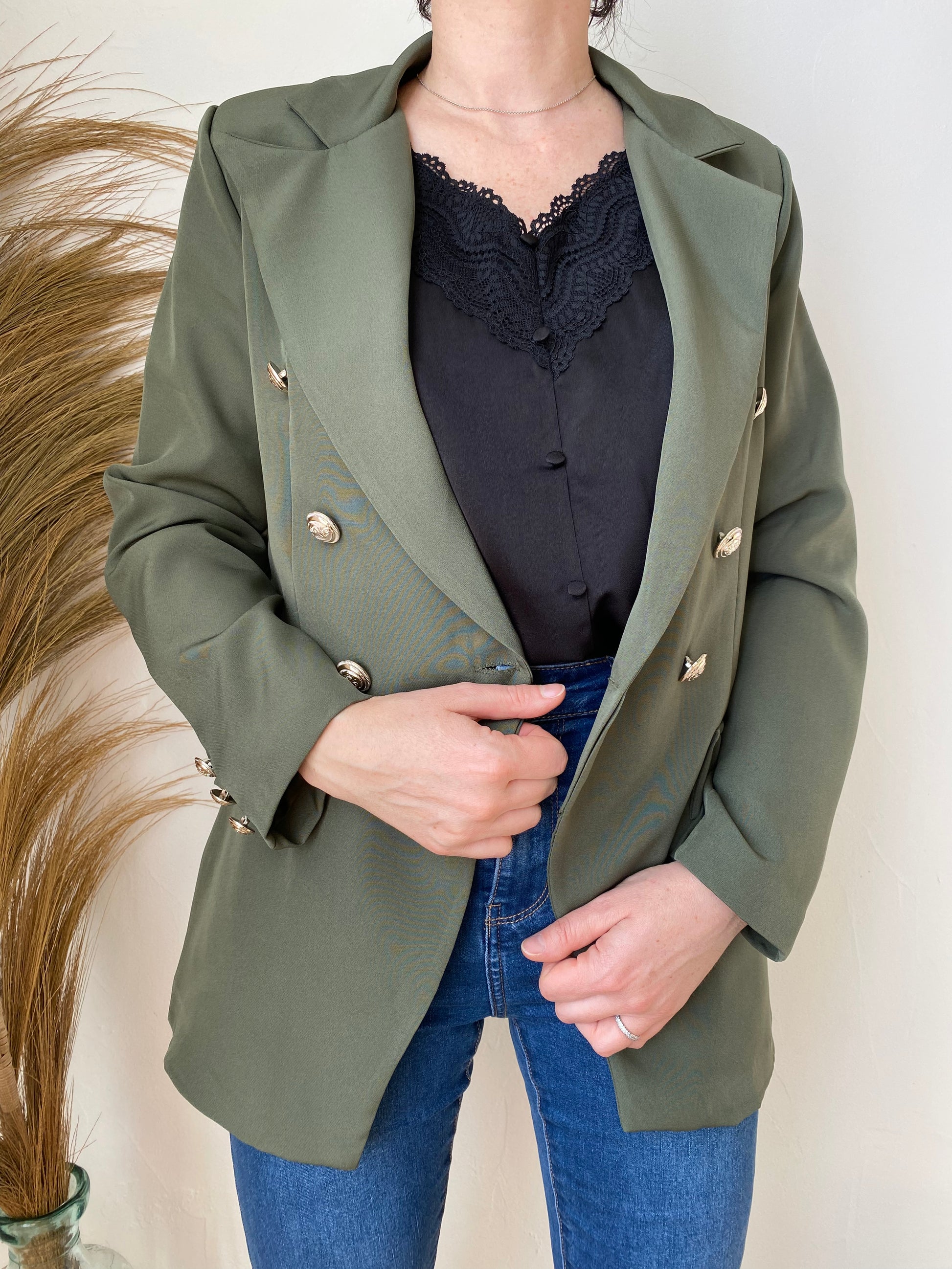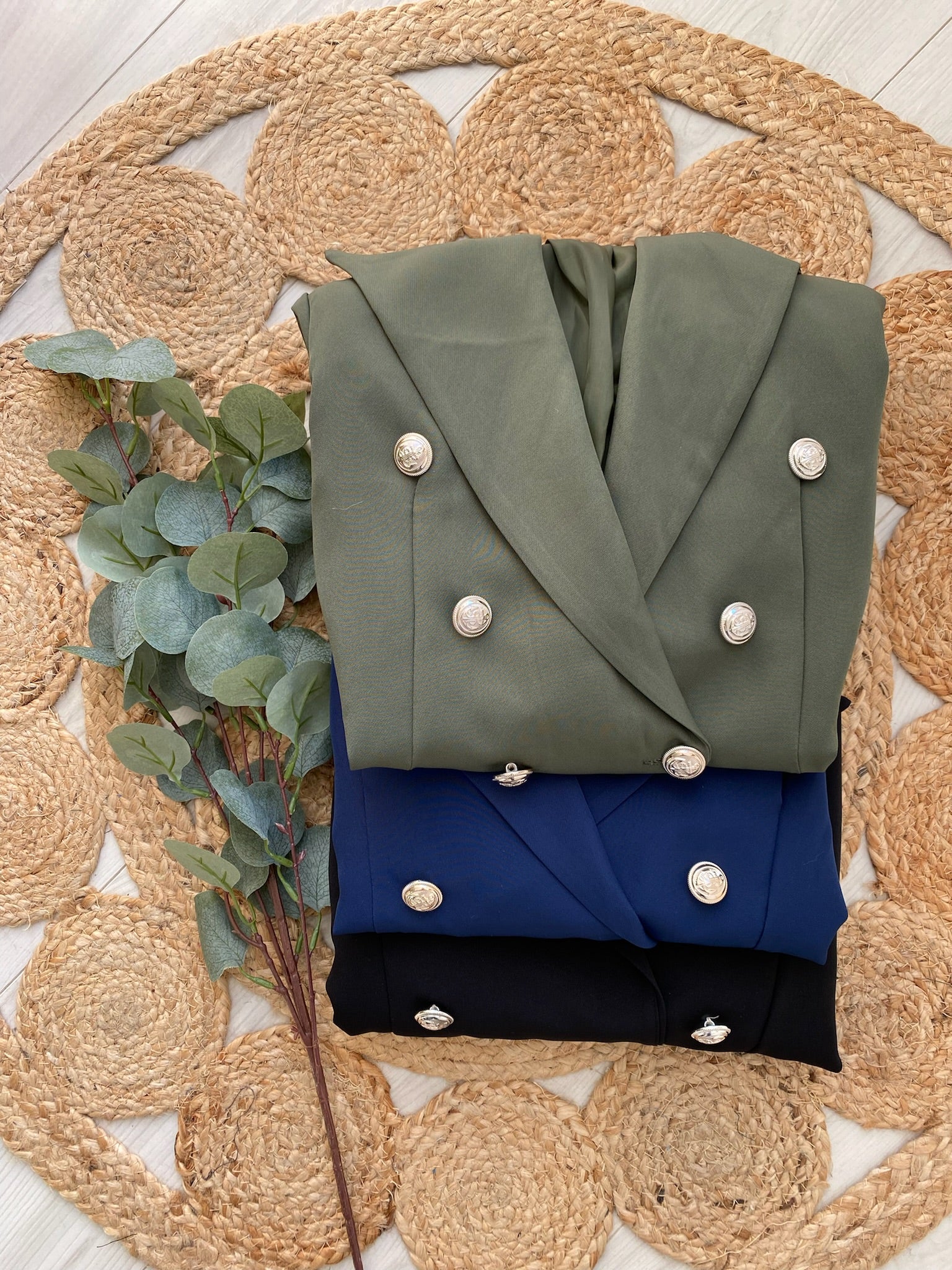. Fausses poches passepoil, pinces devant, épaulettes, boutons marin aux poignets et double rangé devant
